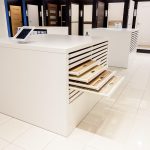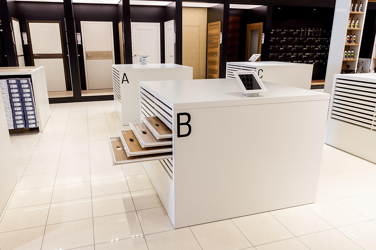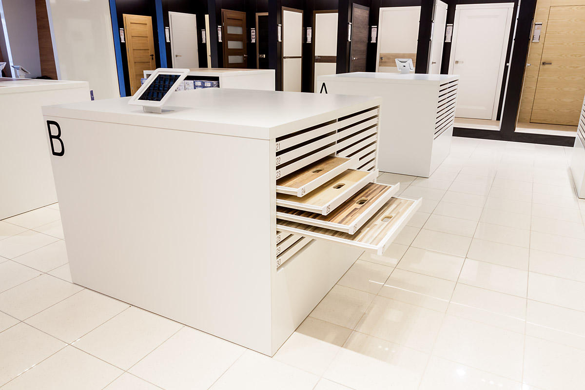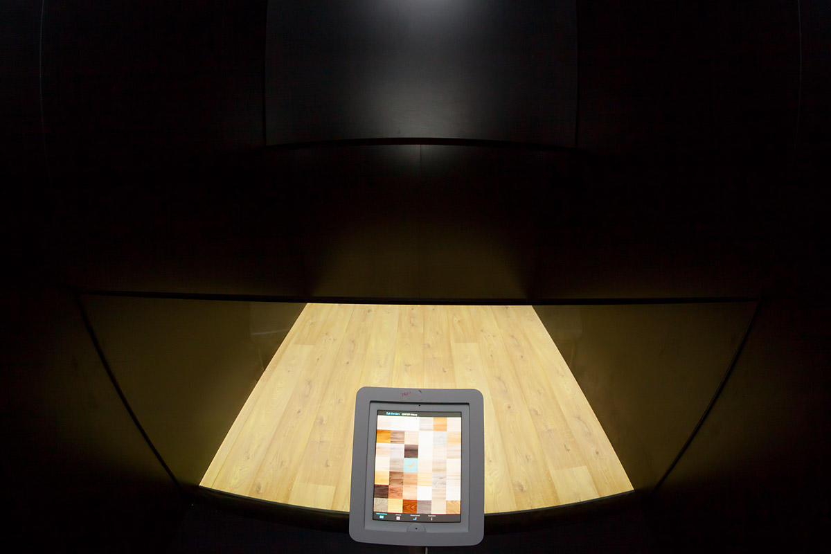 Panele podłogowe w nowym salonie RuckZuck będzie można wybierać na 12 stanowiskach z wysuwanymi wzornikami podłóg. Każde ze stanowisk wyposażone zostanie bowiem w tablet, na którym wyświetlać się będą informacje o kolekcjach, dane techniczne produktów oraz atrakcyjne aranżacje i wizualizacje.