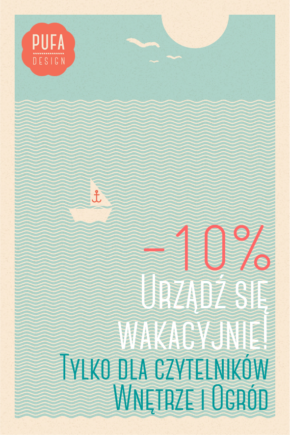 Czy nie miło byłoby urządzić swoje wnętrze wygrzewając się na słonecznej plaży i popijając orzeźwiającą lemoniadę? Teraz jest ku temu doskonała okazja. Tylko dla czytelników magazynu Wnętrze i Ogród, Pufa Design – wiodący sklep internetowy z wyposażeniem wnętrz, przygotował specjalną ofertę na swój cały asortyment. Podając podczas zamówienia kod WiOlato2015 otrzymasz 10% rabatu na wybrane przez siebie produkty. Akcja trwa do 31.08.2015 i obejmuje wszystkie produkty z wyłączeniem aktualnych promocji i wyprzedaży.