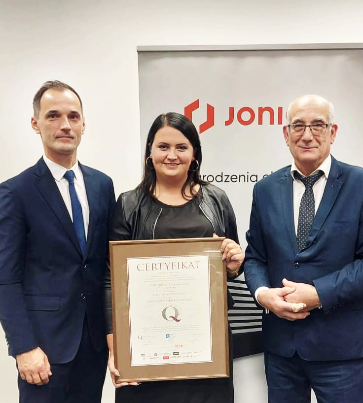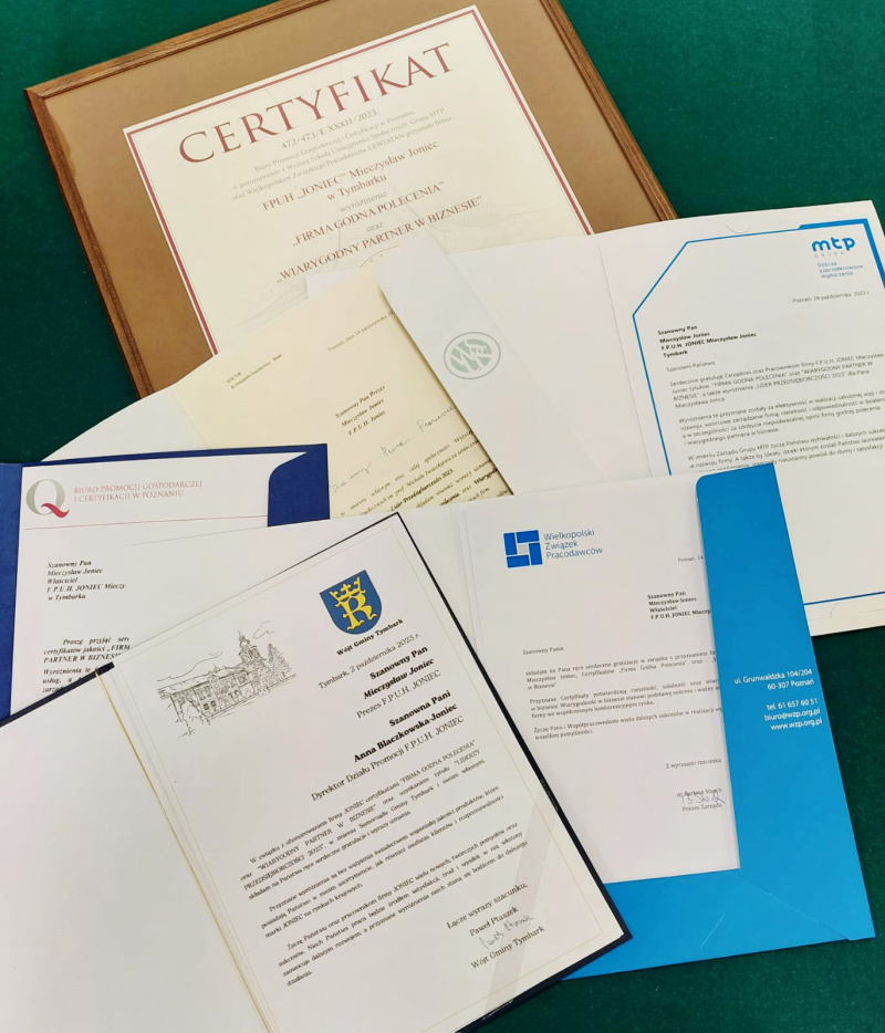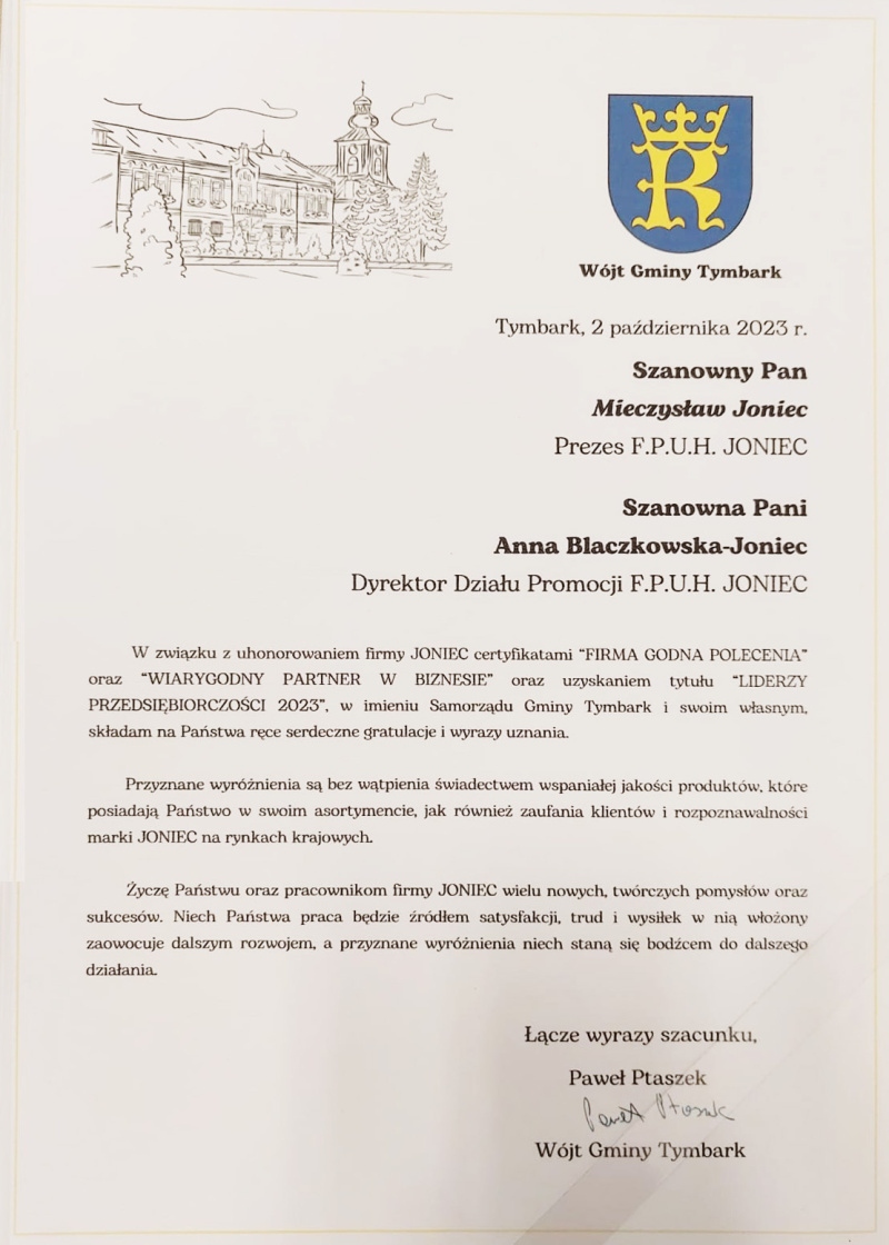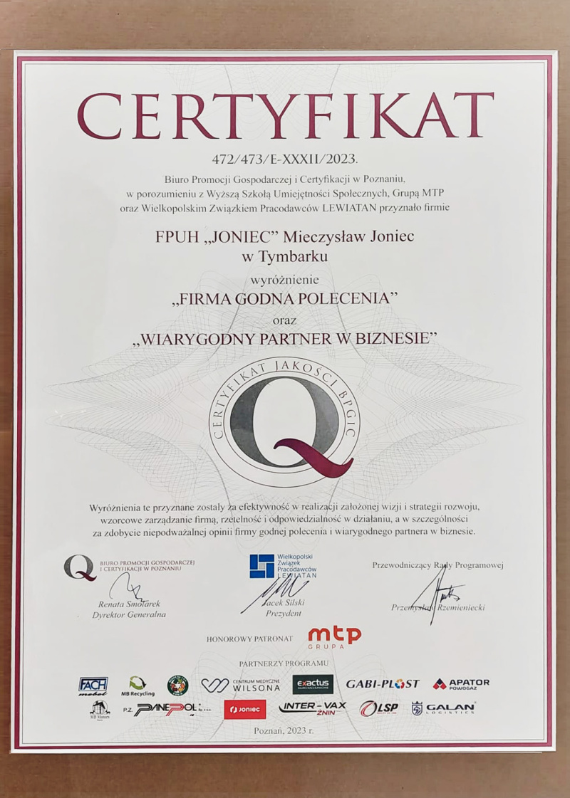 XXIII edycja Gali „Liderzy Przedsiębiorczości” odbyła się 24.10.2023 r. w Wyższej Szkole Umiejętności Społecznych w Poznaniu. Firma JONIEC® uhonorowana została tytułami „FIRMA GODNA POLECENIA” oraz „WIARYGODNY PARTNER W BIZNESIE”. Mieczysław Joniec – właściciel firmy JONIEC® – otrzymał tytuł „LIDER PRZEDSIĘBIORCZOŚCI 2023”. Certyfikaty odebrali przedstawiciele firmy: Monika Wieczorek – Dyrektor Handlowy oraz Ryszard Florek – Kierownik Handlowy.