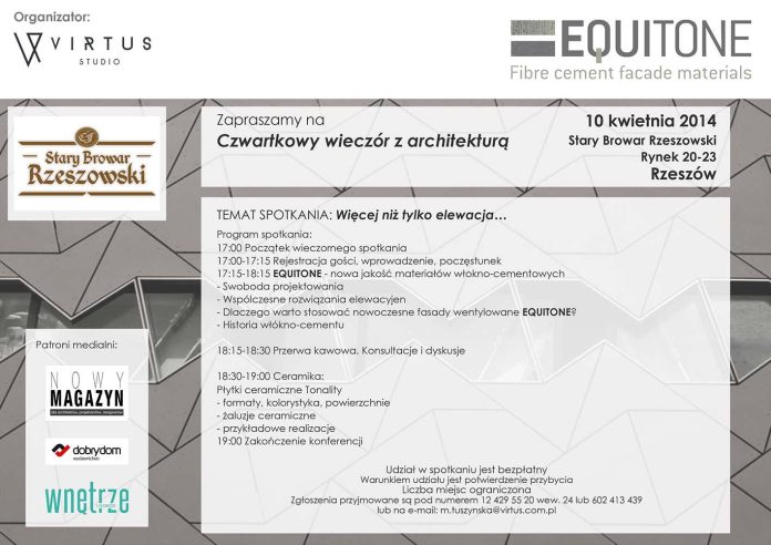 Nowość: Pierwsze w Polsce rozwiązanie systemowe fasady wentylowanej z Aprobatą Techniczną – innowacyjny system dla obiektów niskoenergetycznych i pasywnych zgodny z warunkami technicznymi obowiązującymi od 1.01.2014 Już dziś zapraszamy na wieczorne spotkanie, które odbędzie się 10 kwietnia w Starym Browarze Rzeszowskim, gdzie w miłej atmosferze eksperci EQUITONE przybliżą Państwu tematykę fasad.