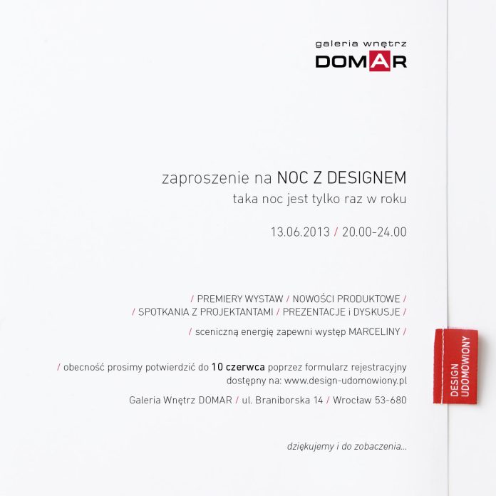 Inauguracja DESIGNU UDOMOWIONEGO 2013. Jedyna taka noc w roku, w trakcie której projektanci i właściciele firm, mogą bezpośrednio porozmawiać ze swoimi klientami – na otwarciu wystaw, prezentacji nowych ekspozycji. Miejsce: Galeria Wnętrz DOMAR, ul. Braniborska 14, Wrocław