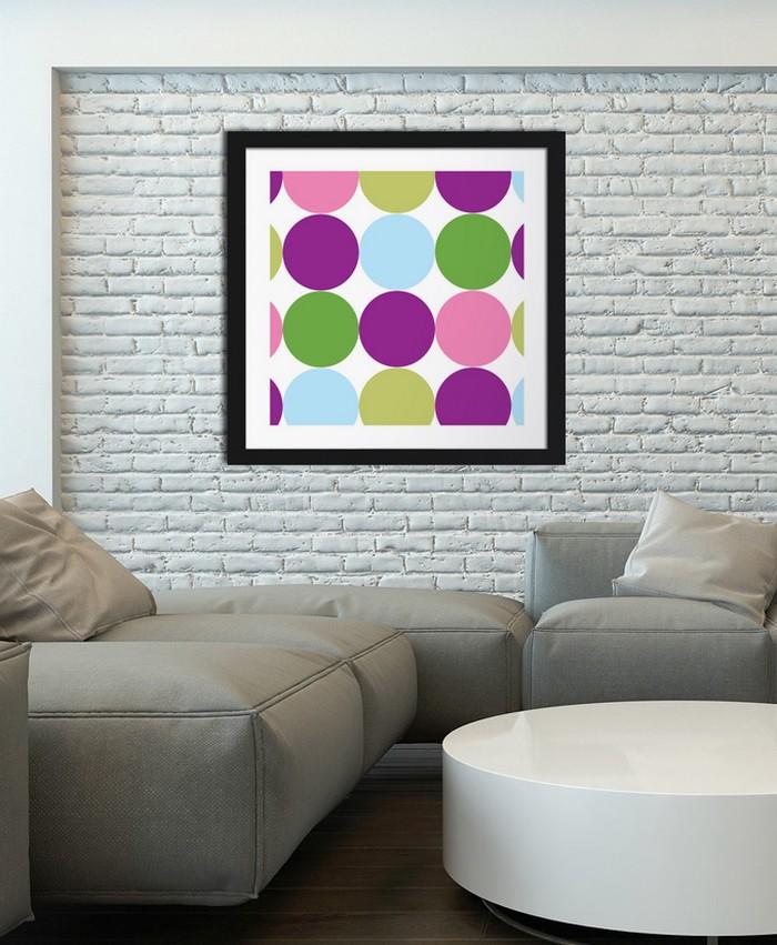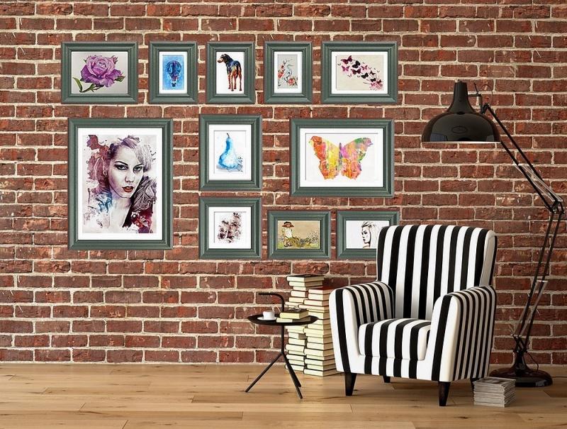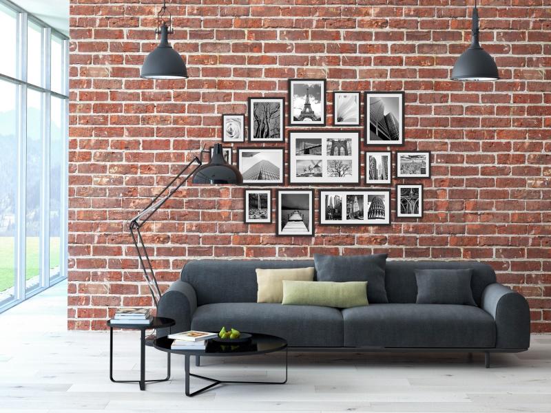 W rzeczy samej struktura i tekstura powierzchni ściany tak bardzo przykuwa uwagę, że z powodzeniem mogłaby zastąpić wszelkie fototapety i bibeloty. Niemniej potrzeba nieustannych modyfikacji jest, zaraz po przyzwyczajeniu, trzecią naturą człowieka. Walczyć z nią nie sposób i najlepiej od razu aktywizować w sobie moc sprawczą, np. poprzez wyodrębnienie w stylizacji salonu strefy nad sofą lub fotelami, tworząc dynamiczną kompozycję z pojedynczych białych ram bądź całej ich galerii. Niewielkie galerie z wewnętrznym passepartout, dzięki swej jasnej kolorystyce, wzorcowo współpracują z ciepłymi odcieniami klinkieru. Umieszczone w nich zdjęcia lub kolorowe obrazy przykują uwagę, wyodrębniając się na tle ściany w interesującym układzie – symetrycznym lub w tzw. twórczym nieładzie. Ponadto połączenie jednorodnych, profilowanych ramek z żywą kolorystką na ciepłym tle w każdym świetle będzie prezentować się bardzo okazale. Galeria rozmaitości to najprostsze i najbezpieczniejsze rozwiązanie, gdy wciąż szukamy swojego ulubionego nurtu i nie jesteśmy do końca zdecydowani na dany styl.