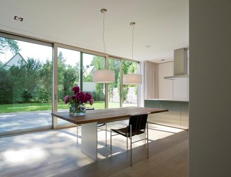 W tak modnych dzisiaj modernistycznych projektach domów szyby mogą zajmować nawet do 90% powierzchni całego okna lub drzwi, dlatego same profile i montaż stolarki muszą być odpowiednio przemyślane, by okna nie ulegały wypaczaniu pod wpływem dużego ciężaru szyby i gwarantowały komfort użytkowania oraz energooszczędność. Technologie stosowane w oknach Schüco PVC pozwalają wykonywać tego typu projekty przy zachowaniu najwyższej funkcjonalności i doskonałych cech użytkowych, związanych z ochroną akustyczną, cieplną czy antywłamaniową. Okna Schüco Thermoplus z siedmioma komorami powietrznymi i potrójnym uszczelnieniem posiadają współczynnik przenikania ciepła na poziomie Uw ≤ 0,8 W/m2K, dlatego mogą być stosowane nawet w domach pasywnych. Termoizolacyjność nie jest w tym przypadku uzyskiwana kosztem szerokości ram okiennych i sztywności, lecz optymalnej głębokości zabudowy (82 mm). Rozwiązanie z solidnymi, opatentowanymi wzmocnieniami aluminiowymi zaskakuje bardzo wąskimi ramami o szerokości czołowej zaledwie 120 mm, dzięki czemu zapewnia lepszy widok i wpuszcza więcej naturalnego światła do pomieszczeń. Otwartą atmosferę wnętrz pozbawionych podziałów pomagają budować wielkoformatowe drzwi przesuwne w wersji Schüco Corona CT 70 HS. Przeszklenie umieszczone w wysmukłej ramie jest płynnie i bezgłośnie przesuwane w kierunku równoległym, nie zajmując przestrzeni, jak w przypadku drzwi uchylnych. W jednej ramie można umieścić jedno, dwa lub cztery skrzydła przesuwne, zaś przejście może się odbywać z dowolnej strony. Konstrukcja pozwala na łączenie przeszklonych zestawów drzwi, z których każdy może posiadać maksymalną szerokość nawet do 6500 mm i wysokość do 2600 mm. System gwarantuje przy tym optymalne parametry przenikalności cieplnej Ud ≤ 1,4 W/m2K i izolacyjności akustycznej do 43 dB.