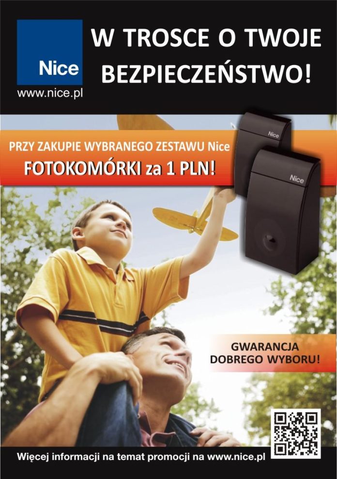 W siłownikach oraz pilotach Nice od lat stosowane są inteligentne rozwiązania, które powodują, że ingerencja z zewnątrz w systemem automatyki jest ograniczona do minimum. Fotokomórki gwarantują poprawne i bezpieczne funkcjonowanie systemu automatyki przydomowej. Wychodząc naprzeciw potrzebom klientów, firma Nice Polska zdecydowała się od 4.03.2013 r. do wybranych zestawów automatyki dołączać komplet fotokomórek Nice FK w cenie 1 zł netto.