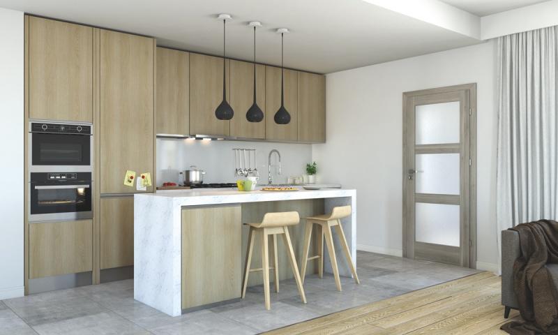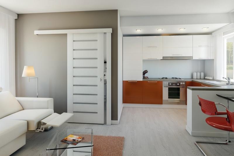 Kolejna sprawa to decyzja, czy wybrać drzwi otwierane do środka pomieszczenia, czy na zewnątrz? Tutaj warto zwrócić uwagę na ciągi komunikacyjne. Dobrze jest, gdy skrzydła otwierają się w stronę ściany i nie blokują innych drzwi. W niektórych pomieszczeniach trzeba uwzględnić też kwestie bezpieczeństwa – w łazience na przykład drzwi powinny otwierać się na zewnątrz. Otwierane w ten sposób skrzydła to też sposób, by zaoszczędzić trochę miejsca w domowych pomieszczeniach. Alternatywą są np. drzwi przesuwne naścienne lub wewnętrzne ścienne, które zajmują niewielką powierzchnię. Skrzydła Porta KONCEPT w wersji przesuwnej wyglądają efektownie i pozwalają subtelnie ukryć dodatkowe pomieszczenie, np. garderobę, spiżarnię czy składzik.