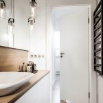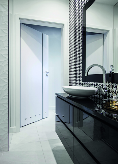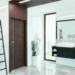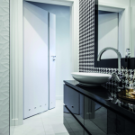 Ciekawą alternatywą będzie stworzenie nieszablonowej przestrzeni, która o poranku pobudzi zmysły odważnym wzorem i kontrastem barw. W takich zestawieniach najlepiej pozostać przy obranej wcześniej kolorystyce i wybrać np. białe drzwi Porta FOCUS Premium w nowoczesnym stylu. Oryginalny charakter wnętrza podkreśli podłużne przeszklenie, które także optycznie powiększy wąską łazienkę. Dzięki wykończeniu drzwi lakierem Premium będą one miały idealnie gładką, a jednocześnie trwałą powierzchnię, wkomponowując się we współczesny klimat aranżacji.