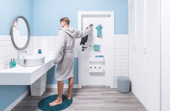 Im więcej półek i szafek w łazience, tym wygodniejsza jest ona w użytkowaniu. Lecz gdy brakuje już miejsca na kolejne meble, ciekawym pomysłem będzie przechowywanie podręcznych przedmiotów na drzwiach. Skrzydła SMART zostały zaprojektowane z myślą o funkcjonalności, dlatego posiadają specjalne otwory, w których z łatwością można zamocować półki czy haczyki. Umożliwia to np. powieszenie ręczników lub stworzenie dodatkowej przestrzeni na najpotrzebniejsze rzeczy. Dodatkowym atutem drzwi jest łatwy demontaż i wymiana akcesoriów oraz minimalistyczne wykończenie – będą one pasować do każdego wnętrza.