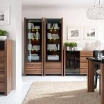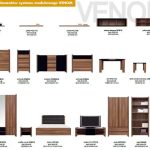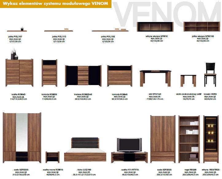 Venom to elegancja zamknięta w kubistycznej formie. Aksamitny, otaczający ciepłem „orzech merano” nabiera szyku w zestawieniu z lśniącymi, gładkimi taflami czerni. Nowoczesny, 19-elementowy system pozwoli na swobodne i gustowne zaaranżowanie salonu, jadalni oraz sypialni. Duża liczba elementów daje wiele możliwości na indywidualną aranżację przestrzeni domu czy mieszkania. Natomiast stylowe dodatki – kolorowe poduszki, narzuty i koce, eleganckie lampy, gładkie zasłony oraz fantazyjne wazony, donice i misy podkreślą wyjątkowy charakter wnętrza. Dodatkowym atutem systemu Venom są nowoczesne rozwiązania technologiczne – halogenowe podświetlenie półek czy system cichego domykania szuflad, które zdecydowanie podnoszą komfort użytkowania mebli. Na uwagę zasługuje również łoże z oryginalnie tapicerowanym wezgłowiem oraz stół i stolik kawowy, których czarne blaty zostały wykonane z hartowanego szkła.