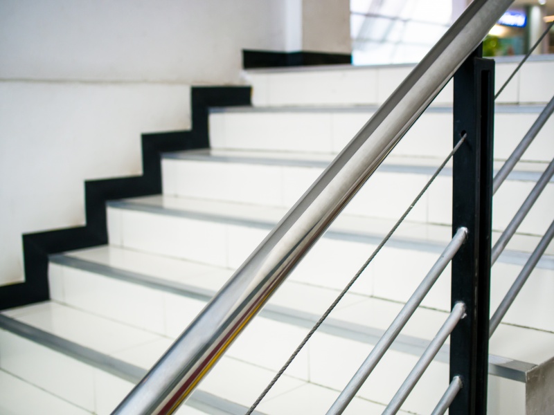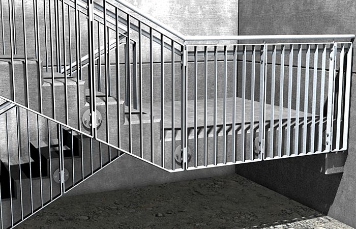 Schody zewnętrzne i wewnętrzne służące do pokonania wysokości przekraczającej 50 cm powinny być zaopatrzone w balustrady lub inne zabezpieczenia od strony przestrzeni otwartej, o wysokości 110 cm. Poręcze powinny się znaleźć na wysokości 85 – 100 cm (pierwsza poręcz) i dodatkowo na wysokości 60 – 75 cm (opcjonalna, druga poręcz). Jeżeli schody mają więcej niż 4m szerokości, należy dodatkowo zamontować balustradę pośrednią.