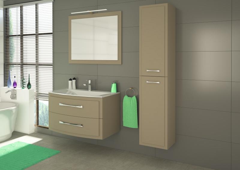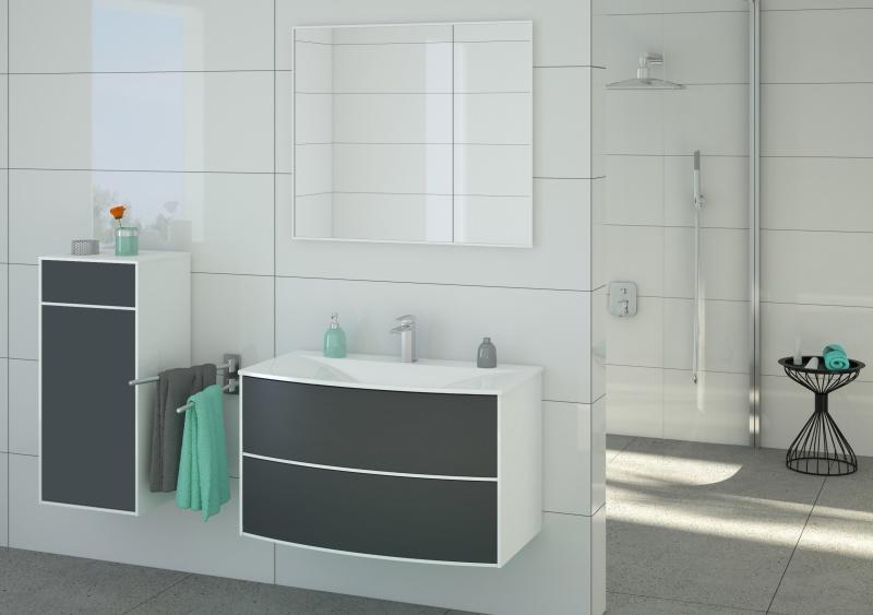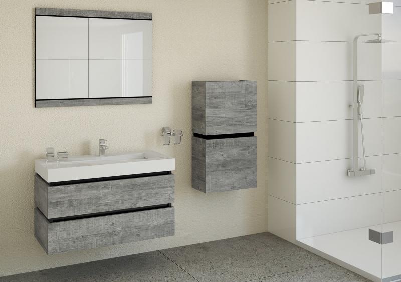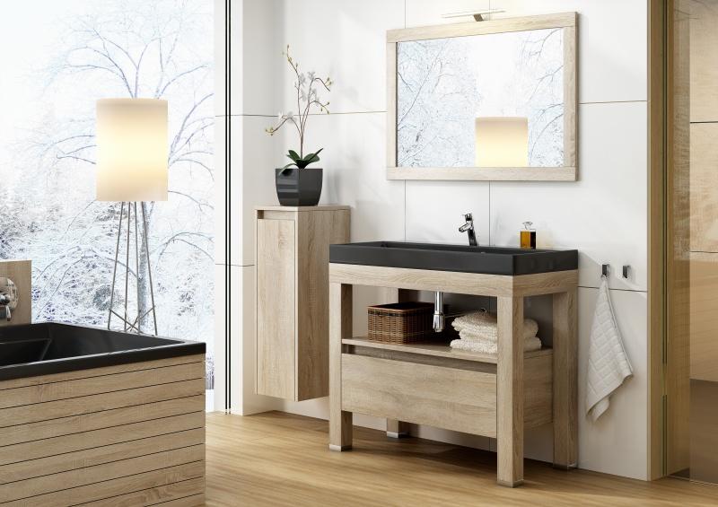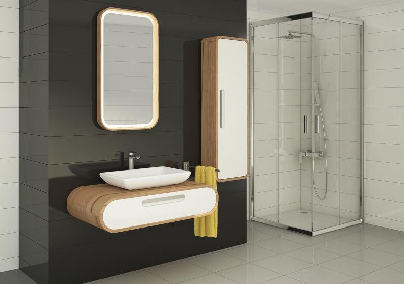 Nasze meble w łazience również mogą wpasować się w motyw natury. Warto postawić na odcienie drewna, zarówno te ciepłe (Vena Arte w kolorze F24), jak i szare, zimne (Viva w kolorze P27, Aria w F70), w zależności jaki akcent obieramy za przewodni. Jeśli jednak preferujemy kolory jednolite mebli, również spotykamy szeroki wybór na rynku – od koloru typu mocca (Luna, kolor F15) po soczystą zieleń (Sonus, kolor F54). Ciekawie prezentuje się również duża czarna umywalka z szafką w dekorze drewna, oparta na solidnych nogach (przykład: seria Ambiente w kolorze P05). Szczególnie interesująco wyglądają szafki w dekorze drewna w wysokim połysku, które odbijając światło tworzą dodatkowy efekt (Aria, Mocca, Vena Arte).
