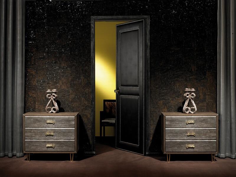 - RODEO DRIVE – zamszowa komoda z 3 szufladami obitymi skórą pytona w kolorze postarzanego srebra, przygotowana w garbarni Hermes’a. Nogi i uchwyty w kształcie klucza projektu Philippe’a Delzers’a wykonane są z polerowanego mosiądzu. Wymiary : szer. 80cm, wys. 70cm, gł. 43 cm