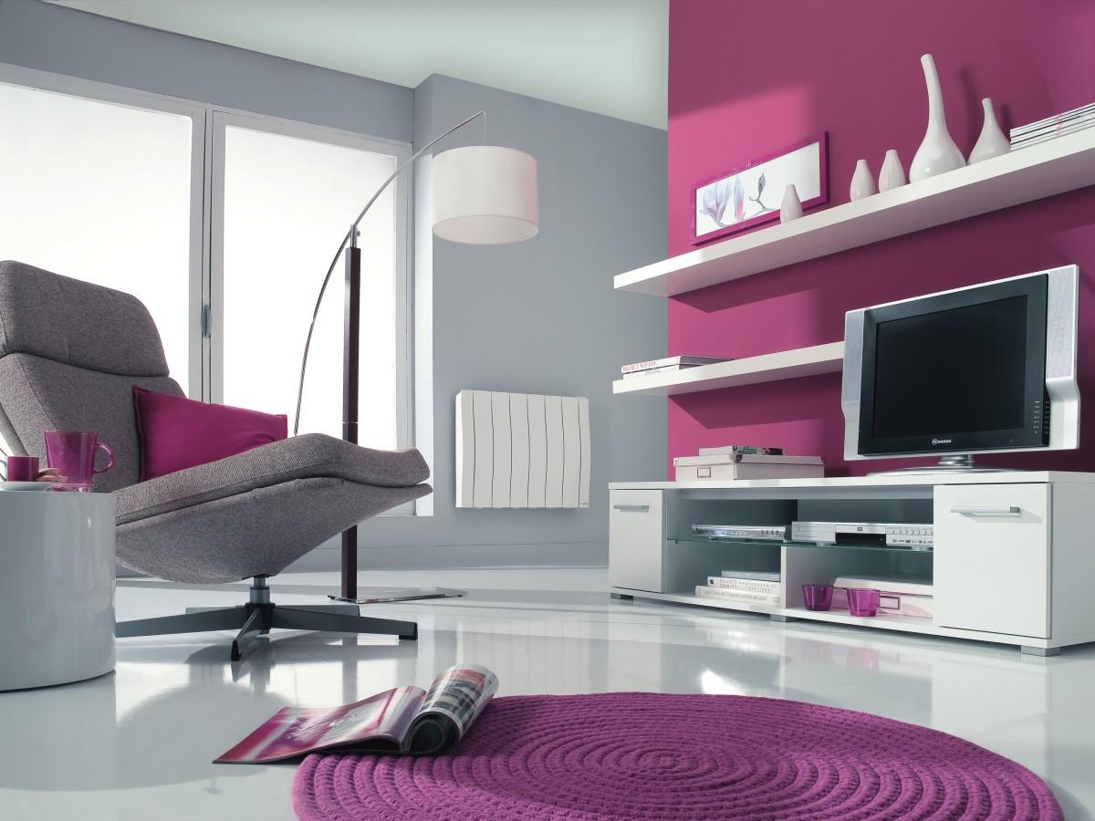Inna propozycja skierowana jest do osób, które chcą mieć również nowoczesny, ale bardziej odważny salon w tonacji fioletu i szarości. Wówczas dwie ściany powinny być pomalowane na fioletowo, a dwie na szaro, ew. wszystkie na szaro, a na fioletowo jedynie główna ściana, na której wisi telewizor. We fiolecie powinny być też dodatki takie jak dywanik, jaśki, naczynia, natomiast stolik rtv i półki powinny być lakierowane na biało i błyszczące. Centralnym punktem takiego salonu niech będzie wysoki, obracany fotel z ciemno-szarej tkaniny. Ceny brutto grzejnika to 1 845zł (1000W), 2 337 zł (1500W) lub 2 706 zł (2000W).