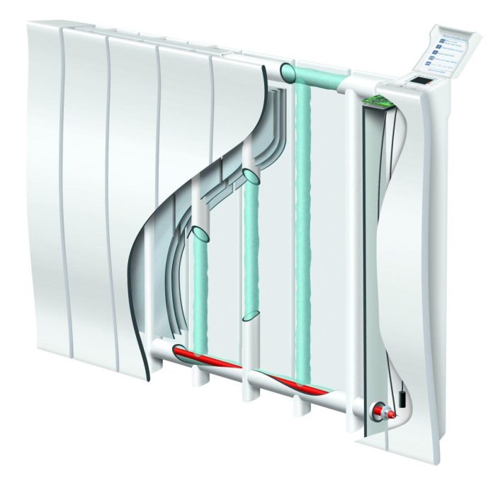 Urządzenie posiada cyfrowy termostat temperatury z wyświetlaczem LCD, którym ustawić można następujące zakresy pracy temperatur: komfort (10-28 st.), antyzamarzanie (7 st.) i eko (komfort pomniejszony o 1-4 st.). Z racji tego, że grzejnik jest kompatybilny z systemem sterowania Pass Program, można zainstalować do niego programator Chronopass. Programator ten umożliwia nie tylko zarządzanie pojedynczym grzejnikiem, ale i całym systemem grzewczym opartym na urządzeniach z gamy Pass Program lub Numeric (termostat elektroniczny). Chronopass pozwala zaprogramować cały tydzień, w którym do wyboru mamy trzy niezależne programy oraz dwa rodzaje temperatur dla każdego z nich.