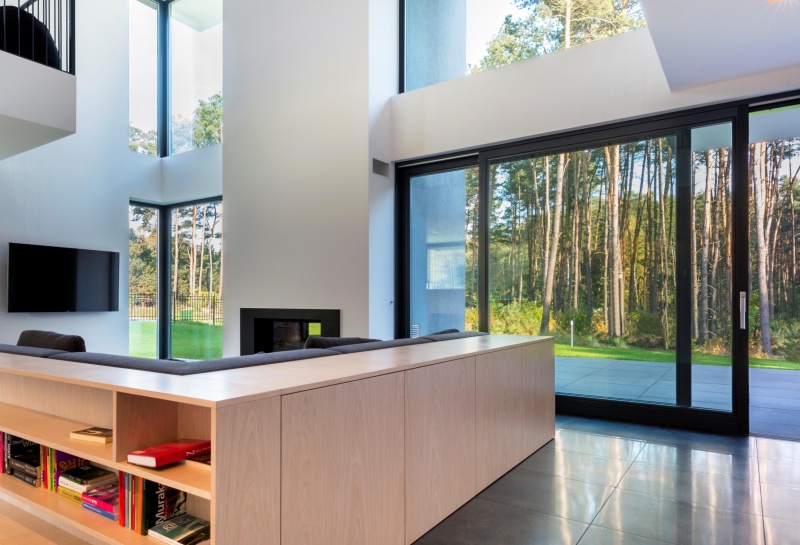 Dzięki dużym przeszkleniom wnętrza prezentują się niezwykle nowocześnie. Szczególnie efektownie wyglądają okna i drzwi tarasowe sięgające od podłogi do sufitu, które zajmują powierzchnię całej ściany. Otwierają one pomieszczenia na otoczenie dodając im przestronności, a krajobraz za oknem staje się integralną częścią wystroju wnętrz.