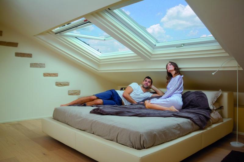 - Więcej słońca! W każdym pokoju powinno znajdować się przynajmniej jedno okno dachowe. Dla dużych przestrzeni warto rozważyć połączenia wielokrotne, modele kolankowe (jak np. Roto WFA) lub okna w dużych rozmiarach (jak np. Roto Comfort i8 lub RotoQ-4).