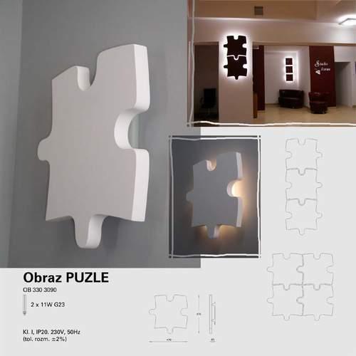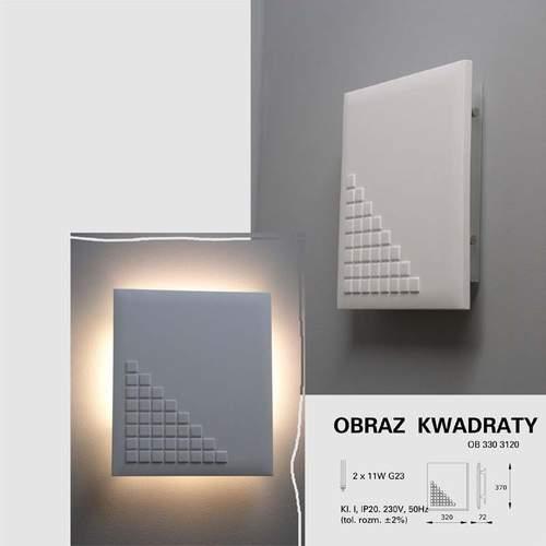 Ciekawy efekt tworzy zestawienie czterech podświetlonych kwadratów lub kilku „puzzli”. Możemy czerpać z bogactwa wzorów i aranżować je w dowolny sposób. Na jasnej ścianie, dobrze wyglądają obrazy pomalowane na ciemny kolor, dobrany do wystroju wnętrza, na przykład do mebli lub dodatków. Najlepiej sprawdzają się kontrastujące rozwiązania: do jasnej ściany – ciemna, ceramiczno – gipsowa lampa, do ciemniej ściany – jasna. Dzięki temu światło emitowane zza obrazów będzie ładnie wyeksponowane. Trzeba wcześniej dokładnie przemyśleć, który fragment pomieszczenia chcemy wyróżnić. Przy tak wyraźnej ozdobie należy bowiem zachować umiar i ograniczyć się do podkreślenia jednej, dwóch ścian. Proste, kwadratowe formy lamp ceramicznych doskonale będą prezentować się zwłaszcza w nowoczesnych i oszczędnie urządzonych wnętrzach. Dodają elegancji i charakteru również w biurze, gdzie mogą stanowić jedyną dekorację.