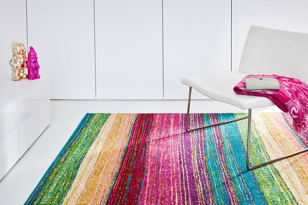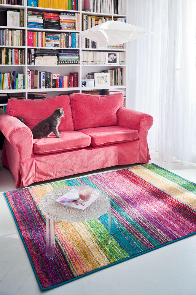 Kolorowe dodatki dobrze sprawdzają się nie tylko w dużych, przestronnych wnętrzach. Równie dobrze wyglądają na niewielkich przestrzeniach, gdzie istnieje potrzeba wniesienia świeżości i światła. Dywan DOR z kolekcji FUNKY Agnelli jest idealnym przykładem tego, jak jeden element może odmienić całą aranżację. Na wzór dywanu składają się nieregularne cienkie pasy w kolorach, których nie sposób zliczyć. W połączeniu z wpadającym przez okno światłem, wygląda on tak, jakby na naszej podłodze zagościła tęcza. Wielobarwność wzoru pozostawia nieskończone możliwości podczas dalszego urządzania idealnego wnętrza. Wystarczy, żeby sofa lub inne elementy wyposażenia nawiązywały do którejkolwiek linii, a obronimy się przed niechcianym kiczem.