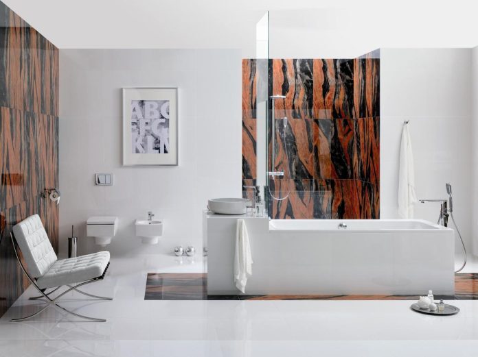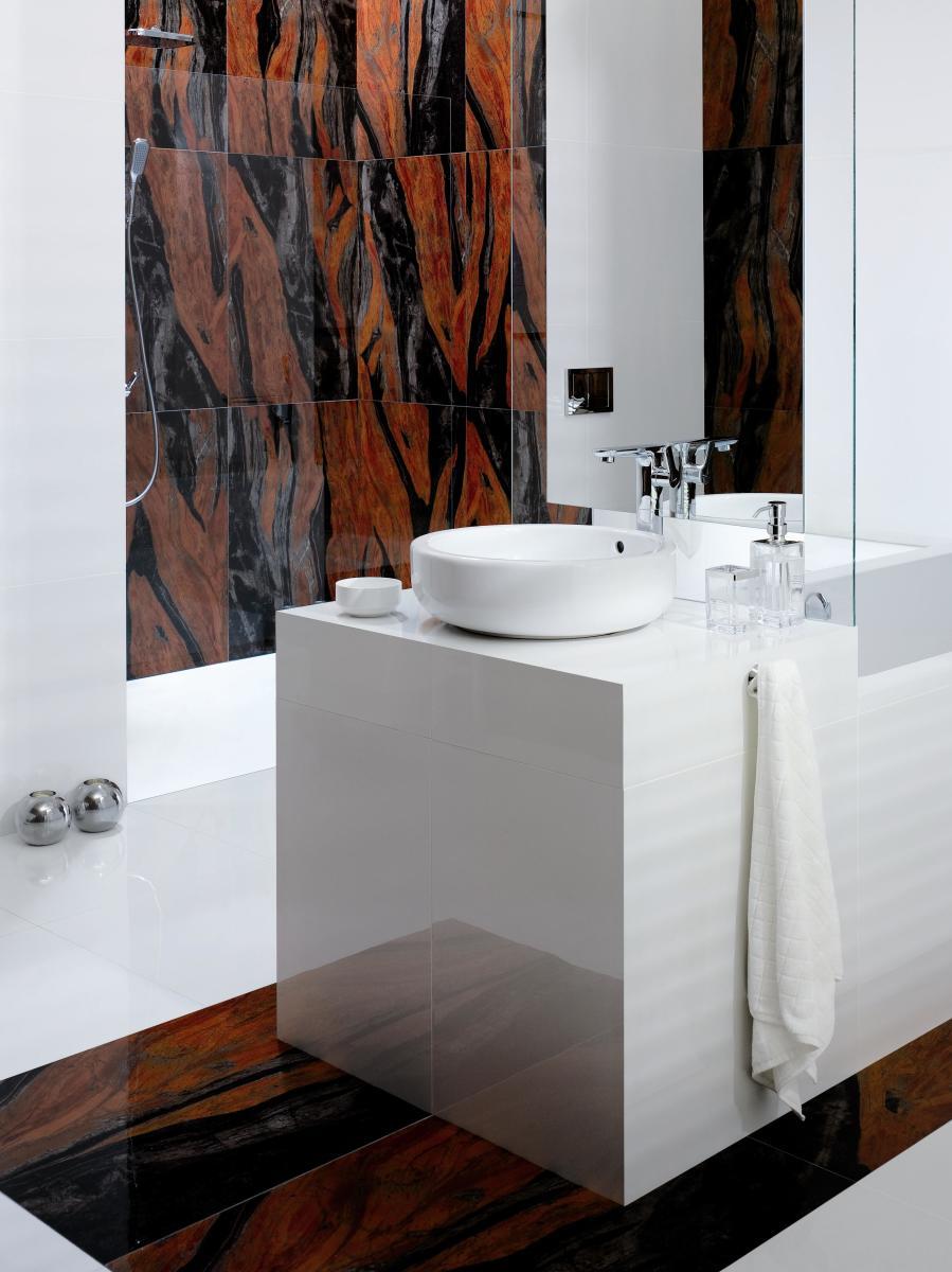 Posiadacze małych wnętrz, szczególnie łazienek nie mają się czego obawiać. Wbrew pozorom duży format optycznie może powiększyć wnętrze. Nic, bowiem, nie zmniejsza wnętrza tak, jak mała ściana pokryta niewielkimi płytkami. Duży format i jednolita faktura, w szczególności uzupełniona lustrami, może zdziałać cuda. Szczególnie wskazane będą płytki w jasnych barwach i o błyszczącej powierzchni. Idealnym rozwiązaniem będą płytki z kolekcji Inferno. Ich piękny ognisty czarno-koralowy wzór przypomina rozżarzoną lawę, a jego „naturalnym” odpowiednikiem jest kamień Butterfly Red. Spolerowaną do lustrzanego połysku powierzchnię pokrywa sieć żyłek i pęknięć. Można zastosować płytę jedynie w jednym miejscu, na przykład pod prysznicem, na ścianie, na której usytuowana jest umywalka. Będzie to idealny kontrast dla żywiołów wody i ognia – mówi stylistka marki, Joanna Ciecierska. Kolekcję Inferno proponujemy zestawić z gładkimi powierzchniami gresu Super Black i Super White.
