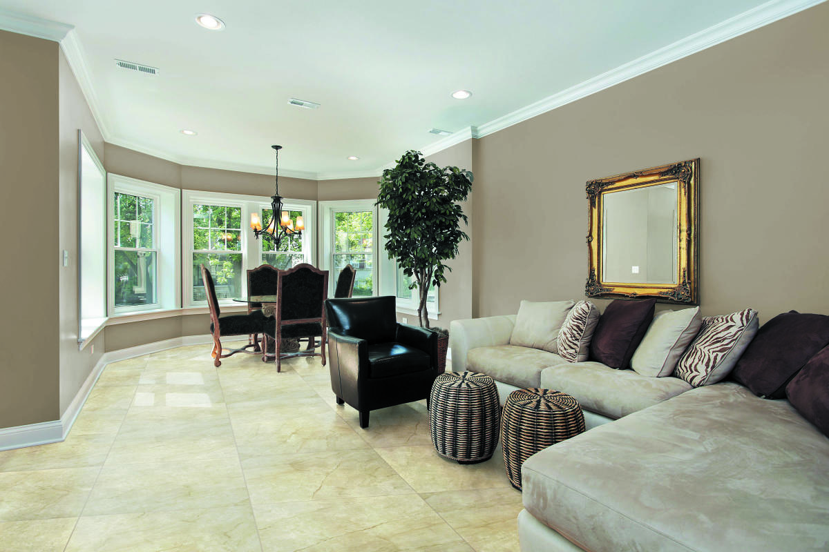 Bosco Gold to najcieplejsza z propozycji. Dzięki licznym spękaniom i wzorzystym żyłkom niemal przypomina drzewo. Lapideo to płytka z subtelnym rysunkiem kamienia w piaskowo beżowym odcieniu. Trzecia z propozycji Deserto to wzór klasycznego rzymskiego trawertynu w jasnobeżowej kolorystyce, który wprowadzi atmosferę luksusu do każdego pomieszczenia. Ze względu na kamienny wzór, przed położeniem zaprawy, radzimy sprawdzić, jakie ułożenie poszczególnych płyt będzie Państwu najbardziej odpowiadać – radzi stylistka marki Joanna Ciecierska. Jako dopełnienie stylizacji proponujemy zastosowanie neutralnych i naturalnych barw. Idealnie sprawdzą się skórzane meble – dodaje.