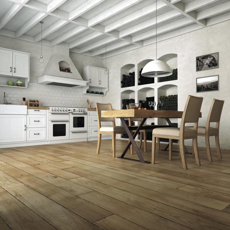 Producent nie był tutaj gołosłowny. Te podłogi naprawdę wyglądają jak z renesansowego zamku czy wiejskiej chaty. Poszczególne dekory mają celowo wykonane drobne uszkodzenia: rysy, wgniecenia, a nawet otwory przypominające ślady korników! Efekt jest niezwykły. To podłoga idealna dla miłośników niebanalnych wnętrz.