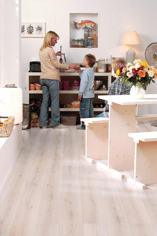 Przy układaniu należy kierować się zwykle kierunkiem padania światła w pomieszczeniu i montować panele równolegle do niego. Jeżeli w pomieszczeniu jest więcej okien, kierunek może wyznaczać światło padające z największego okna. Kto nie jest pewien, powinien najpierw ułożyć na próbę kilka rzędów paneli bez zatrzaskiwania w jednym i w drugim kierunku. Dzięki komfortowej technice zatrzaskowej finalne układanie podłogi będzie później dziecinnie proste. Z zasady należy zachować odległość 10 mm od ściany, w pomieszczeniach o szerokości ponad osiem metrów powinna zostać pośrodku wykonana szczelina dylatacyjna. Odpowiednie listwy i profile stanowią dopełnienie idealnego wyglądu podłogi. Laminowana podłoga ułożona zgodnie z zasadami sztuki budowlanej będzie nas cieszyć swoją urodą przez wiele lat – a przy następnym remoncie da się ją ponownie wykorzystać.