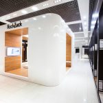 – Centrum ekspozycji salonu stanowią boksy, z których każdy spełnia inną funkcję. Najważniejszy jest niewątpliwie kubik stanowiący multimedialny projektor stojący w tylnej części sklepu – jest to rozwiązanie, którego dotąd na rynku nie było – podkreśla Rafał Grudziąż, współautor projektu. W centralnej części kubika, w zupełnie zaciemnionym pomieszczeniu, zainstalowano rzutnik multimedialny. W tym miejscu za pomocą iPada mamy możliwość obejrzenia dowolnej podłogi z oferty salonu, a jej obraz zostanie wyświetlany na podłodze w skali 1:1 w rozmiarze 2 x 2 m. W bocznych częściach boksu znalazło się także dodatkowe miejsca na ekspozycję listew łączących, sztukaterii oraz próbek fornirów. W pozostałych kubikach umieszczono ladę oraz konfigurator wnętrz, w którym znajdują się iPady ze oprogramowaniem pozwalającym na wyposażenie swojego wnętrza w produkty dostępne w sklepie. Stworzona w ten sposób aranżacja będzie wyświetlana na ekranie tv.