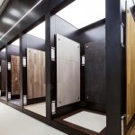 Kolorystyka wnętrza i materiały wykończenia to kwintesencja nowoczesnego stylu. Dominują dwie barwy – czarny to tło ekspozycji kolorowych podłóg i drzwi, natomiast biały stanowi centrum showroomu. Duże boksy zostały obłożone laminatem hpl w połysku, reszta jest wykończona w półmacie.