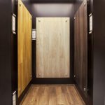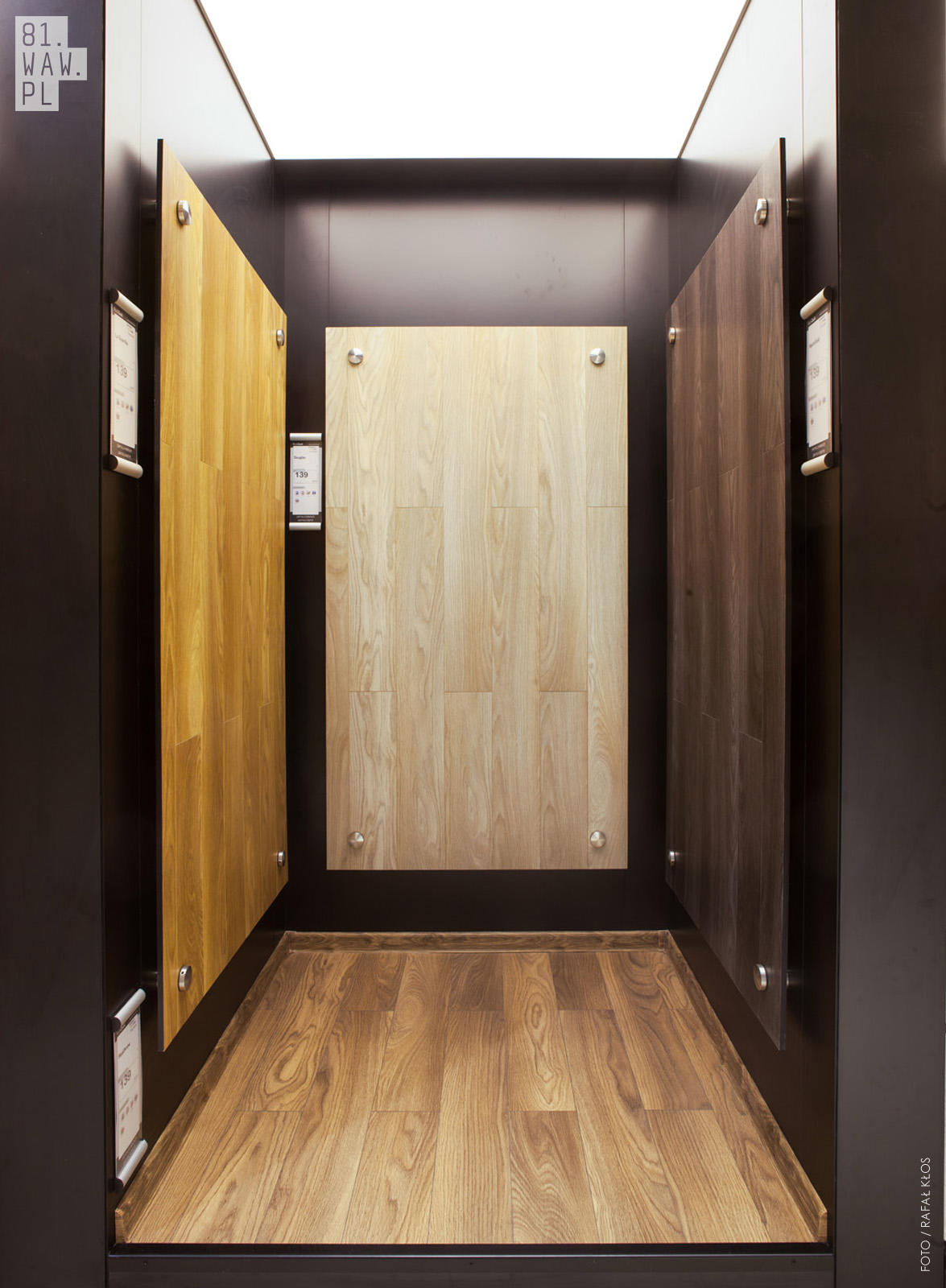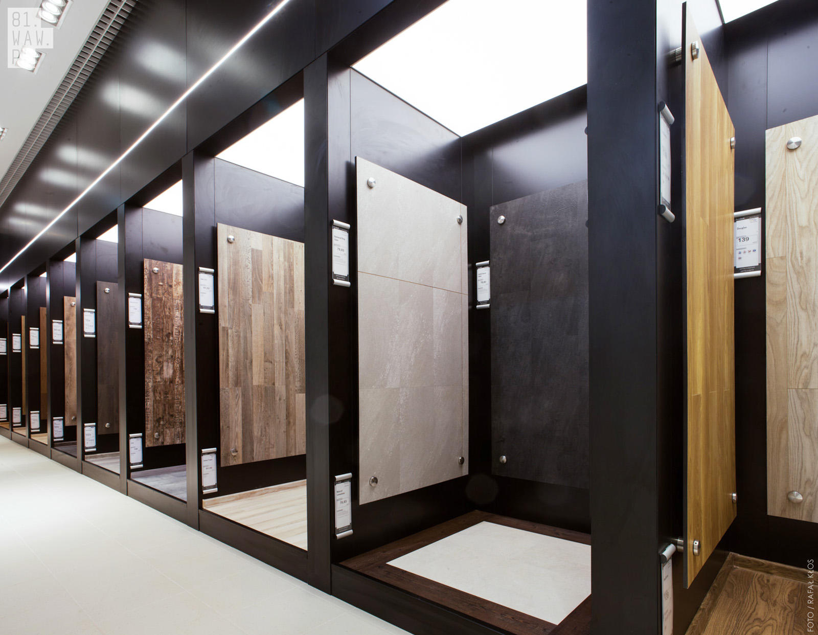 Po prawej stronie od wejścia umieszczono oświetlone przez napinany sufit wnęki z ekspozycją podłóg – w sumie 88 różnych modeli. Lewa część wystawy jest lustrzanym odzwierciedleniem prawej, różnią się jedynie asortymentem. W tej części znalazło się 66 modeli drzwi, dodatkowo na końcu salonu jest ściana, na której znajdują się dwa rodzaje drzwi przesuwnych oraz modele specjalistyczne – wieloskrzydłowe i zewnętrzne. W showroomie wydzielono także miejsce na wzorniki podłóg. Próbniki w formie prostopadłościanów umieszczono w dwóch rzędach, po bokach lady – w sumie ustawiono ich 8. W każdym z nich mieści się 40 próbek podłóg, które możemy obejrzeć wysuwając szuflady. Na każdym kubiku umieszczony jest iPad, na którym przeczytamy szczegółowe informacje o konkretnej próbce podłogi.