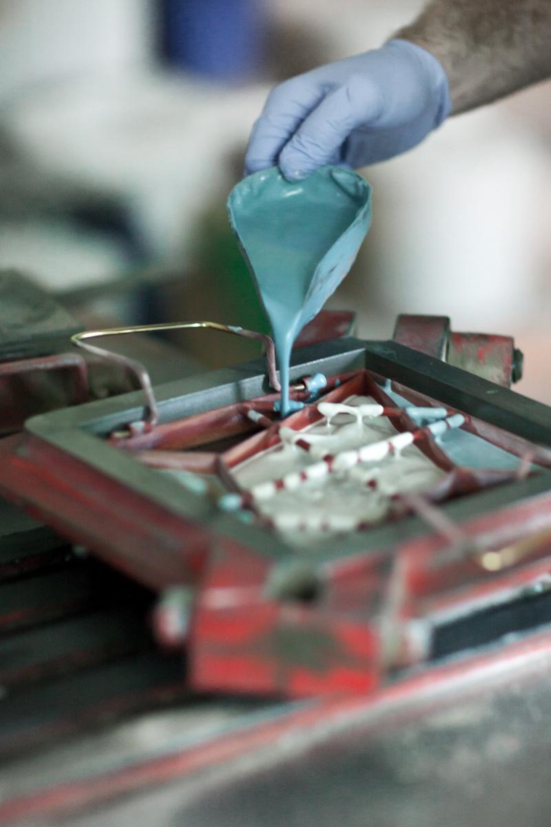 Kafle Purpury są wytwarzane w żeliwnej formie zgodnie z recepturą zaczerpniętą od hiszpańskich rzemieślników, u których terminowała właścicielka manufaktury. Do ich produkcji używa się wyłącznie naturalnych surowców: cementu portlandzkiego, włoskiego marmuru i piasku. Najpierw rzemieślnik umieszcza w formie wzornik, który wypełnia płynną masą marmurowo-cementową – każde pole w wybranym kolorze. Gdy wszystkie pola są wypełnione, wzornik jest wyciągany, a powierzchnia kafla jest posypywana mieszaniną cementu i piasku. Tak przygotowaną płytkę umieszcza się pod prasą. Sprasowany z siłą kilkudziesięciu atmosfer kafel schnie następnie przez cztery tygodnie w suszarni.
