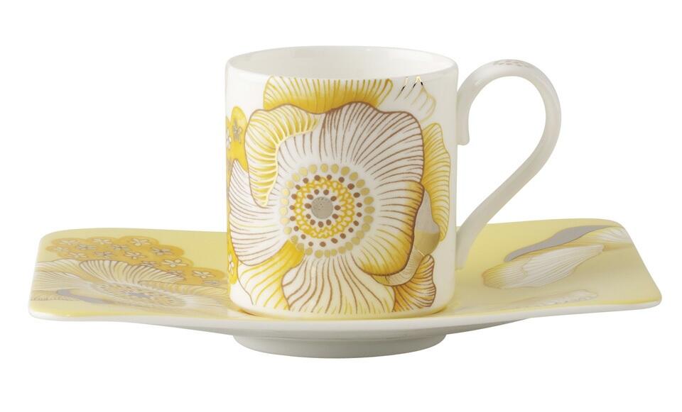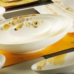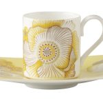 Inspirowane kwiatami piwonii, ozdobne wzory kolekcji Modern Grace Peonia, przywodzą na myśl klasyczną zastawę stołową, zachowując jednocześnie jej modernistyczny styl. Połączenie wyrazistych odcieni żółtego i stonowanych barw metali szlachetnych, nadaje kolekcji harmonijny charakter. Utrwala go obraz delikatnych, naszkicowanych z niezwykłą precyzją kwiatów. Jest to nowa, zaskakująca dla Modern Grace estetyka – dotychczasową cechowało połączenie wyrafinowanych kształtów ze śnieżnobiałą porcelaną, lub biało-szarą w przypadku kolekcji Modern Grace Grey.