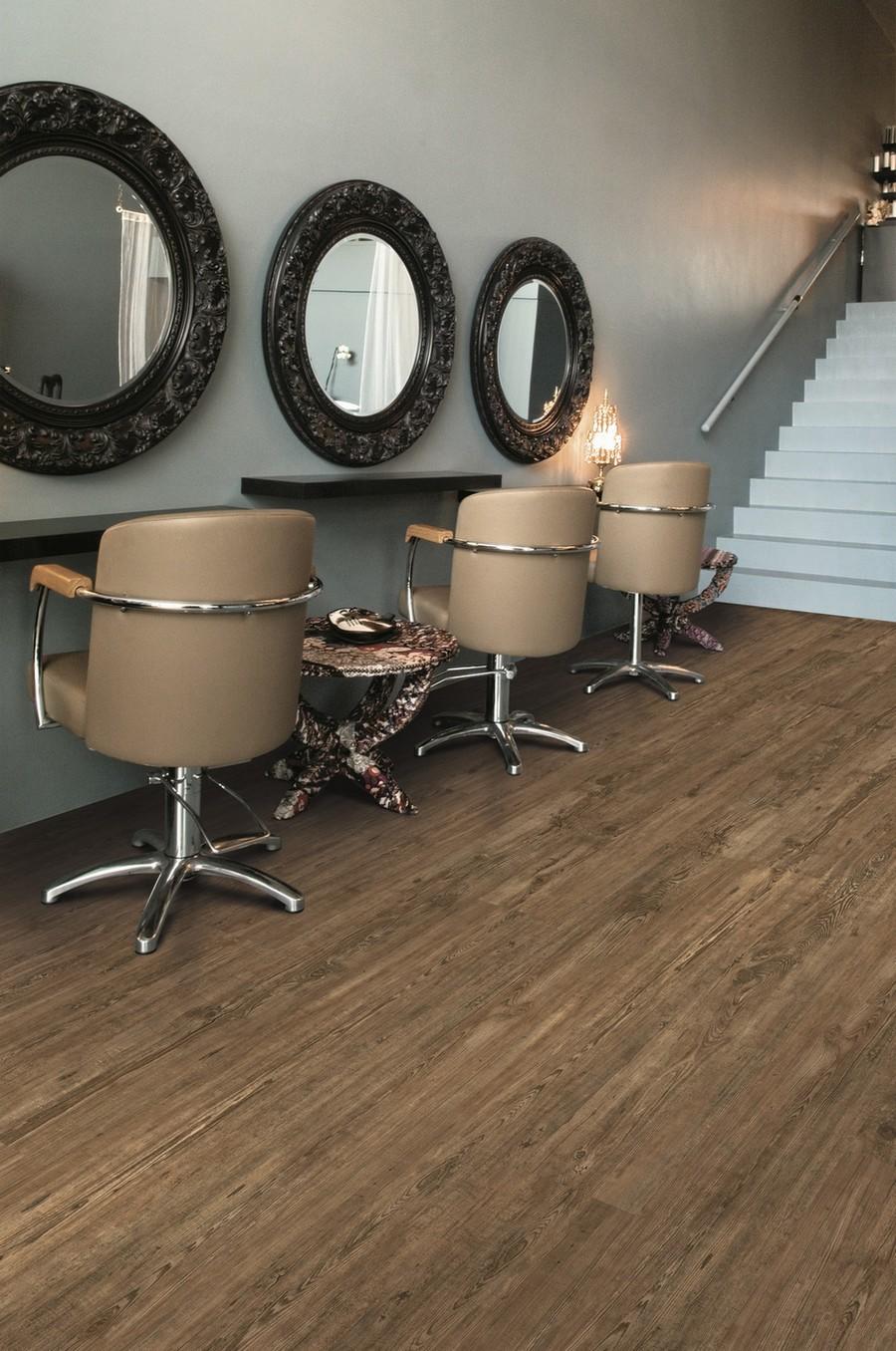 W salonach usługowych, do których codziennie przychodzi duża grupa klientów powinna panować przede wszystkim atmosfera pełna relaksu i wyciszenia. Interesującą propozycją dla tych pomieszczeń jest podłoga Maple, o lekkim brązowym odcieniu, na której dobrze wyglądać będą drewniane meble w podobnej ciepłej kolorystyce oraz wszelkie niezbędne dekoracyjne przedmioty, często o wyrazistej barwie i nieco zaoblonej formie. W podobnej tonacji urządzone zostanie wnętrze, w którym położymy podłogę winylową Rustic Sand Pine o kolorze ciemnego, głębokiego brązu. Znajdujące się tu sprzęty o tradycyjnych wykończeniach, jak choćby lekko rzeźbione ramy luster czy filigranowe stoliki w różnych odcieniach beżu z dodatkiem czerni czy bieli utworzą piękną, harmonijną i jednocześnie niezwykle przyjazną przestrzeń. Przestrzeń, w której zarówno klienci jak i pracownicy będą czuli się doskonale.