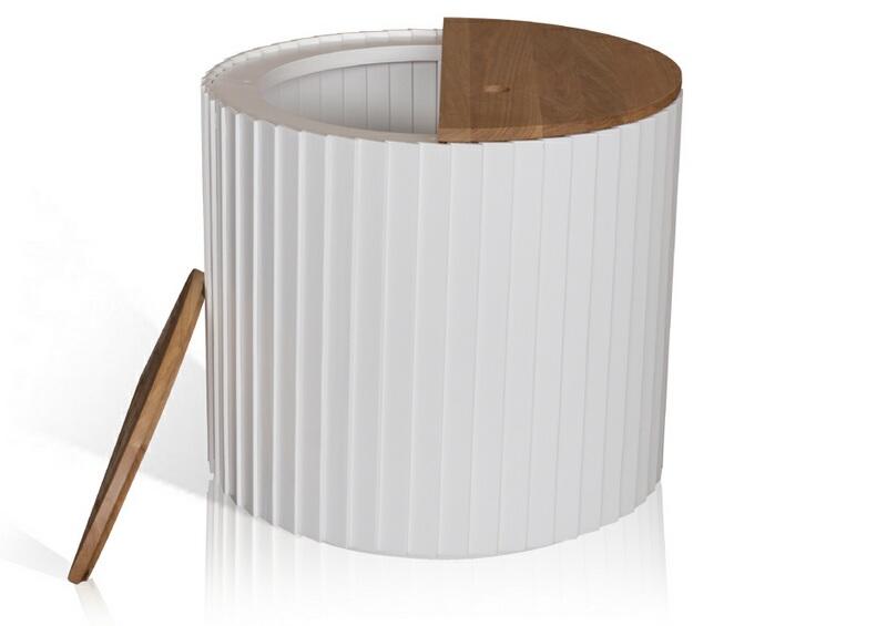 Meble zaprojektowane przez Wayne’a Maxwella cechuje nie tylko spójna stylistyka, ale także funkcjonalność. Projektant nie zapomniał, że meble mają spełniać swoje podstawowe zadania, a najlepiej, jeśli można je wykorzystać w różnych sytuacjach. Idealnym przykładem jest stolik-schowek MAX 02. Może służyć jako stolik kawowy i pomocniczy, ale również jako praktyczny schowek na drobiazgi. Jego blat składa się z dwóch części w kształcie półkola; każdą można osobno zdjąć – zadanie ułatwiają dwa niewielkie otworki. Blat, który wykonano z drewna dębowego, wykończony jest bejcą i przezroczystym lakierem, który podkreśla naturalną barwę i rysunek drewna tworzony przez słoje. Bardzo ciekawą częścią jest podstawa stolika w kształcie walca, która wygląda tak, jakby wykonano ją z plisowanej tkaniny lub papieru. Podstawa wykonana została z drewna sosnowego pomalowanego białą wodną farbą akrylową.