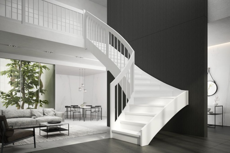 Schody spiralne wyróżnia estetyczny wygląd, świetnie komponujący się szczególnie w nowoczesnych salonach. Ze względu na strzelistą, pionową, wpisaną w rzut kwadratu konstrukcję zajmują mało miejsca, nawet jeżeli umieszczone są w centralnej części pomieszczenia (np. w sytuacji, gdy podłoga antresoli stanowi jednocześnie część sufitu w salonie). W zależności od potrzeb, schody spiralne bywają prawo- i lewoskrętne, a ich stopnie mogą przybierać kształt trójkąta, wycinka koła lub trapezu. Duży wpływ na komfort poruszania się ma szerokość stopni, sięgająca nawet 100 cm, jak i oplatająca konstrukcję balustrada, zamykająca bieg schodowy.