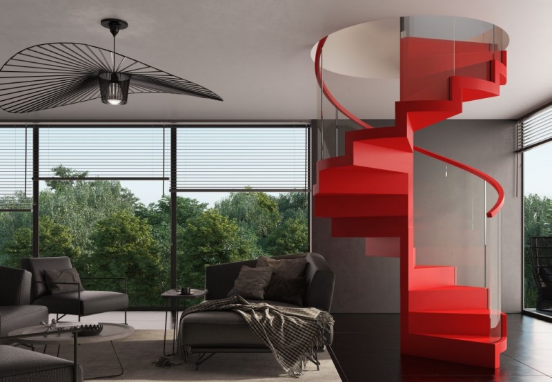 Równie oryginalnym elementem przestrzeni są schody w kolorze czerwonym – idealne do wnętrz, które mają zrywać z niekonwencjonalnym podejściem do kształtów, barw i materiałów. Schody o takim wybarwieniu warto umieścić w niezaciemnionym pomieszczeniu, najlepiej na jasnym tle. Intensywne barwy potrzebują bowiem mocnego oświetlenia, dzięki czemu ocieplają wnętrze, nie przytłaczając dynamicznym odcieniem. Poza tym, takie barwy nie powinny zajmować więcej niż 10 proc. przestrzeni, dlatego decydując się na czerwone schody, warto wybrać model spiralny.