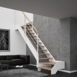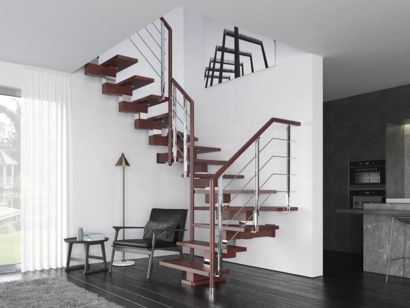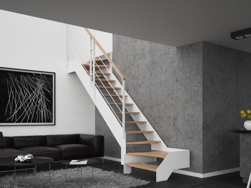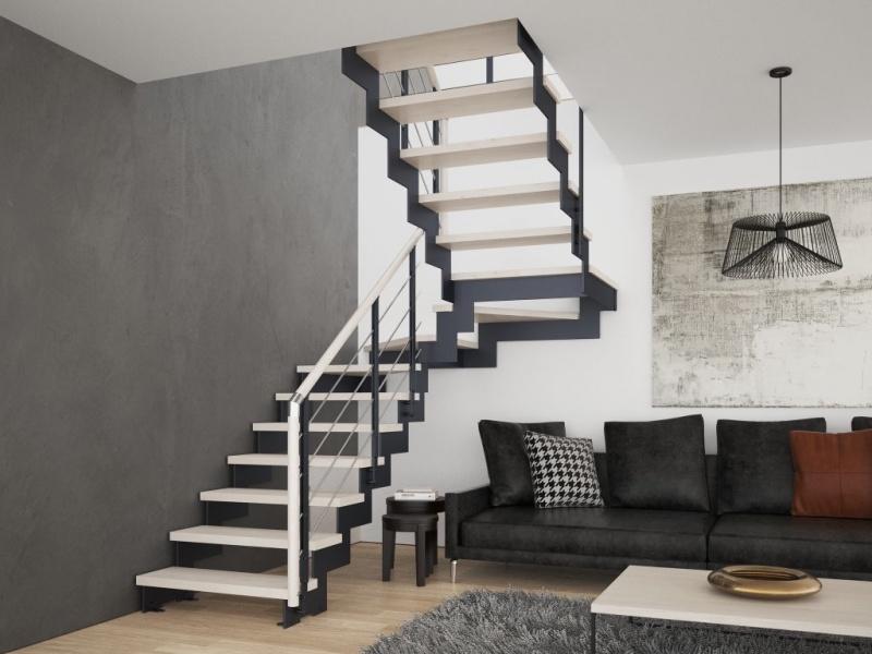 Schody w kształcie litery L to modele jednozabiegowe, czyli takie, które tylko raz zmieniają swój kierunek, skręcając pod kątem 90 stopni w stronę prawą lub lewą. Mogą, choć nie muszą, mieć spocznik, czyli międzypiętrowy podest przedzielający biegi, ułatwiający poruszanie się po schodach. Na wysokości skrętu ich stopnie zmieniają głębokość, przez co kształtem przypominają klin czy trójkąt.
