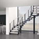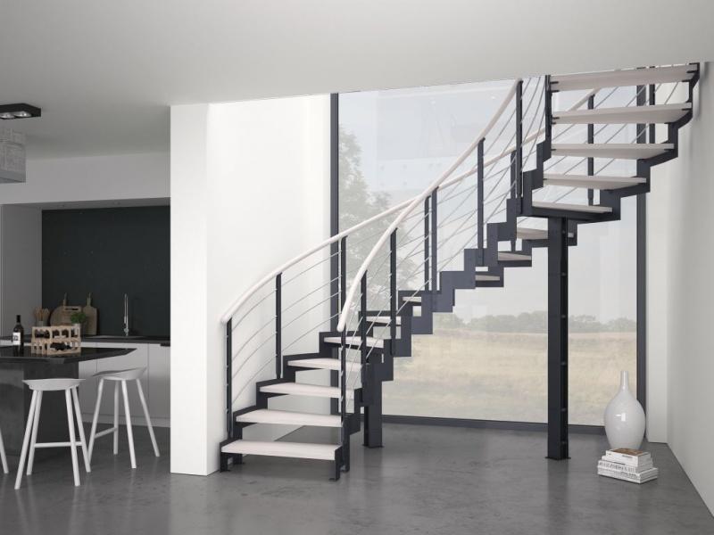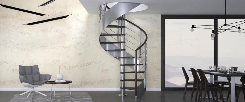 Eklektyczne połączenie ciemnego drewna w kolorze wenge z surową, zimną stalą – nierdzewną lub malowaną proszkowo, jest idealną stylizacją we wnętrzach nowoczesnych i modernistycznych. Mimo zastosowania dość masywnych materiałów i zimnych odcieni, kręta konstrukcja schodów powoduje, że nie tracą one na lekkości i subtelności. Zaskakują za to spójną, harmonijną kompozycją formy, koloru i dodatków. Mogą nim być np. metalowy policzek wstęgowy lub fantazyjna balustrada – o tralkach przypominających wysmukłe liście lub bardziej modernistycznych, o geometrycznej lub zaoblonej formie.