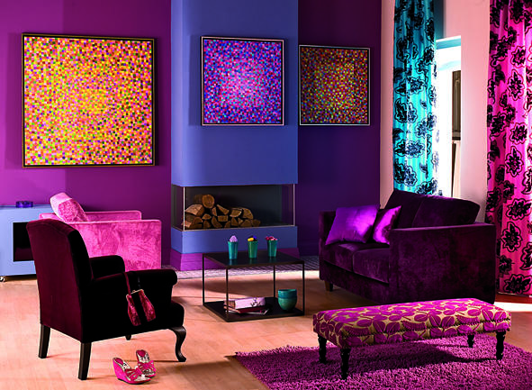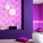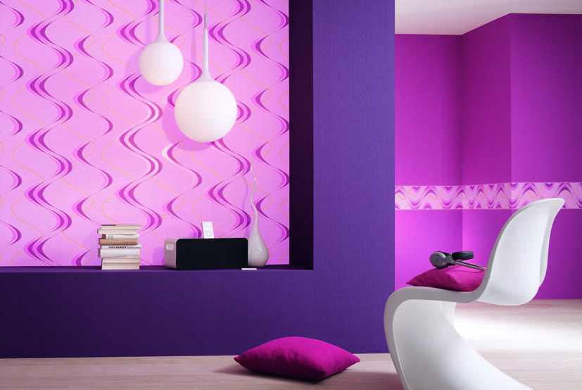 W pomieszczeniach, z małą ilością dodatków, można zaszaleć i zastosować efekty strukturalne na ścianach i namalować np.: szlaczki, pasy lub motywy roślinne. Miejsca, na które chcemy skierować uwagę odwiedzających lub fragmenty słabo oświetlone, możemy wyeksponować, wprowadzając inny mocniejszy kolor w tym wypadku jest to fiolet połączony z delikatnym różem.