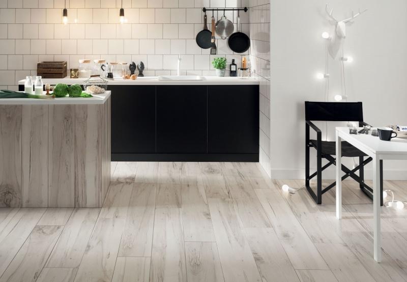 Płytki marki Korzilius przez swoją wysoką klasę ścieralności oraz odporność na skrajne temperatury i plamy świetnie sprawdzą się m. in. w kuchni. Mogą zostać ułożone nie tylko na podłogach, ale i ścianach. Doskonałym sposobem wykorzystania desek Korzilius jest użycie ich jako okładziny blatów kuchennych czy wyspy. Połączenie płytek z kolekcji Wood Land Grey z niezawodnym zestawieniem bieli i czerni stworzy elegancką, nowoczesną przestrzeń, w której każdy posiłek będzie smakował wyjątkowo.