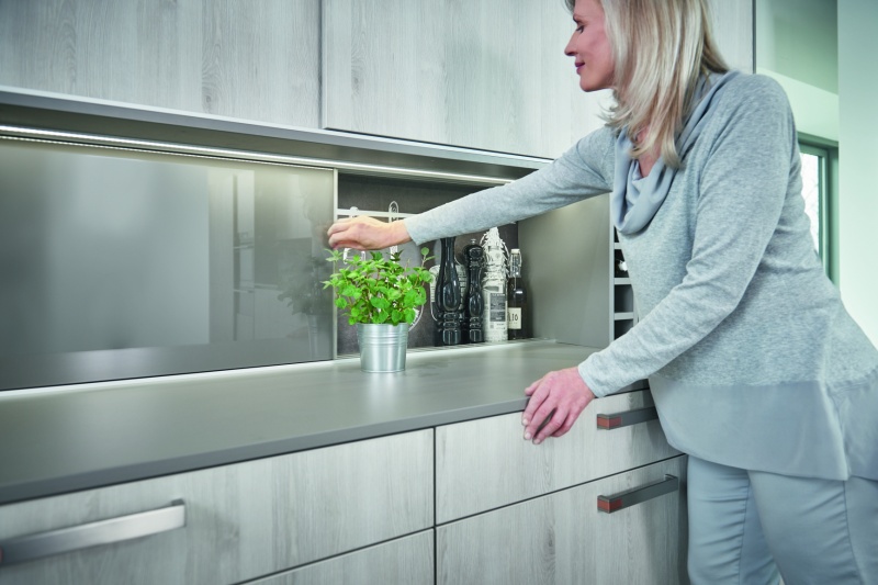 System SlideLine M do przesuwnych drzwi wpuszczanych ma szczególną zaletę – pozwala zabudować miejsca, które często pozostają niezagospodarowane, np. przestrzeń pomiędzy blatem kuchennym a górną zabudową. To dodatkowe miejsce do przechowywania, dyskretnie ukryte za estetycznym frontem przesuwnym, który można skomponować ze stylistyką całej zabudowy meblowej. W tak zaaranżowanym schowku możemy przechowywać podręczne akcesoria kuchenne, porządkując w ten sposób blat kuchenny. Wystarczy jednym ruchem dłoni przesunąć front, aby ukryć zawartość schowka.