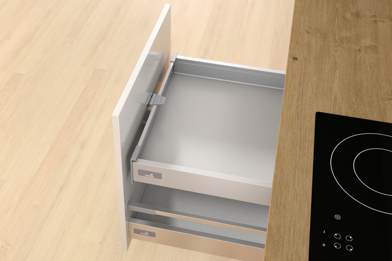 Jeżeli chcemy sięgnąć po produkty czy naczynia z dolnego poziomu wysokiej szuflady, wystarczy, bez schylania się, unieść zabierak. Szuflada wewnętrzna schowa się wówczas w korpusie mebla.