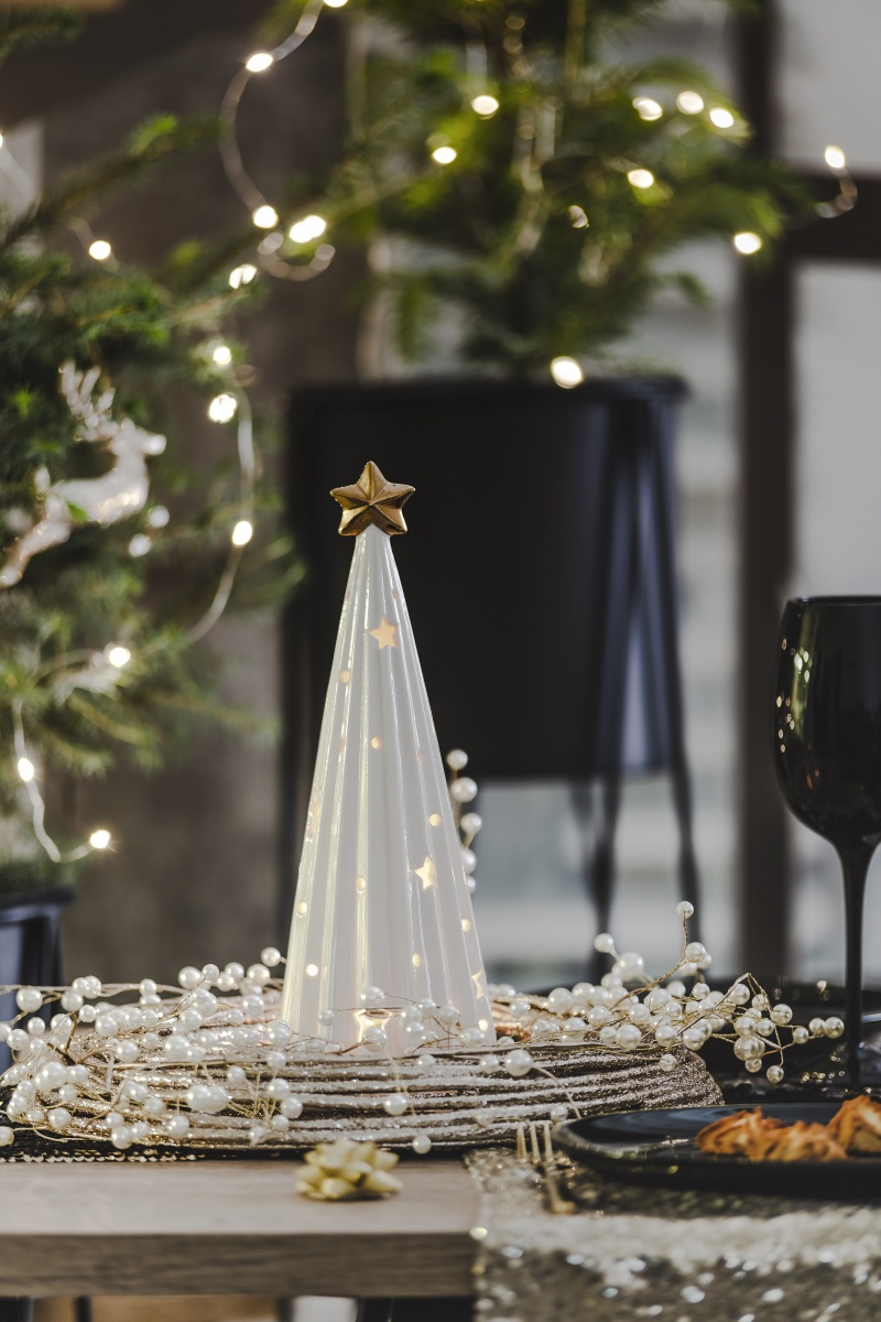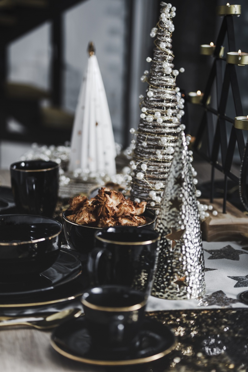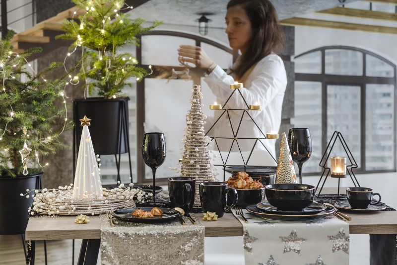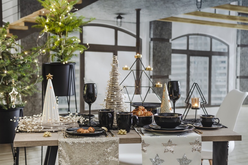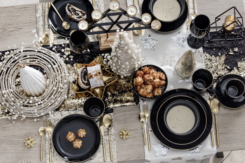 Geometria oraz mocne zestawienie czerni i bieli – to przepis na wystrój wnętrza, który zadowoli spragnionych nowoczesnego designu, także podczas świąt. Całość okraszona złotymi elementami dekoracyjnymi, które swoim blaskiem przekują prostotę w nastrojową elegancję. Aranżacja stołu stworzona zgodnie z tymi zasadami to gwarancja harmonijnej i stylowej oprawy wieczornej kolacji.