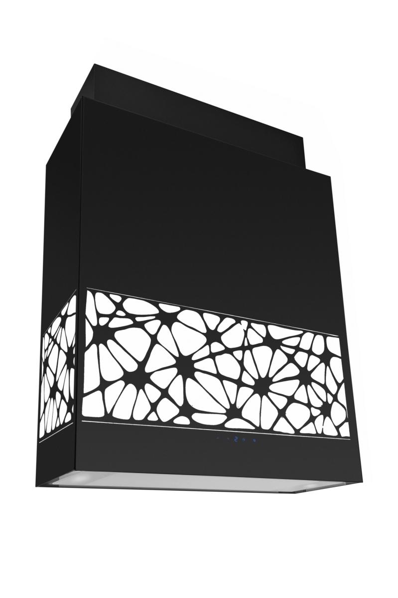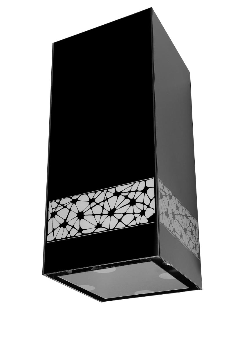 Dekoracyjny okap wyspowy KR Glass Design W marki Ciarko Design powstał z myślą o użytkownikach ceniących zarówno prostą, surową formę, jak i elegancję oraz luksus. Okap wykonany został z wysokiej jakości czarnego szkła ozdobionego białą podświetlaną aplikacją, która podkreśla wytworny charakter urządzenia. Szklane akcenty, ze względu na walory estetyczne oraz łatwość w utrzymaniu w czystości, to coraz bardziej pożądane przez projektantów i użytkowników elementy wystroju wnętrz.