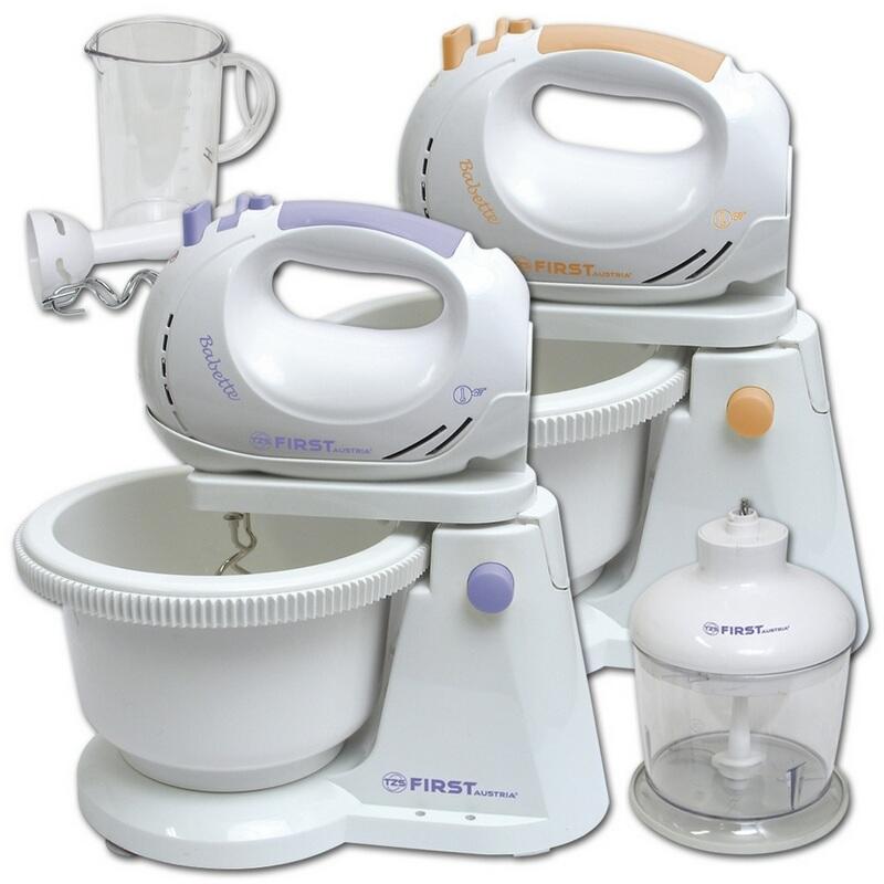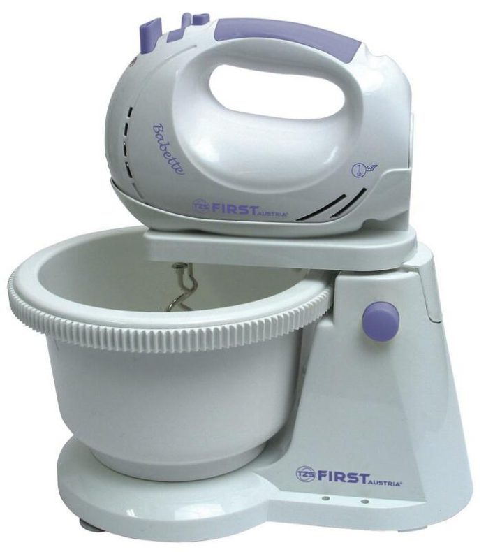 Stacjonarne miksery kuchenne posiadają stabilną podstawę z misą, do której mocowany jest korpus z końcówkami. Charakteryzują się większą liczbą poziomów prędkości, pojemnością misy czy w końcu jakością wykonania. Mikser marki First Austria z powodzeniem może być używany jako robot kuchenny – umieszczony na podstawie nadaje się do ubijania cięższych ciast, takich jak sernik czy babka, a ręcznie, jako zwyczajny mikser przeznaczony do lżejszych zadań. Takie rozwiązanie poprawia komfort wykonywanej pracy. Dodatkowo obrotowa miska, sprawia że wszystkie składniki są dużo lepiej wymieszanie niż w standardowych urządzeniach tego typu. Z pomocą miksera można miksować, siekać, ubijać, ugniatać, a także przyrządzać koktajle, czy sosy do potraw. Konstrukcja posiada również sześciostopniową regulację prędkości, dzięki czemu można dostosować odpowiednią ilość obrotów do ubijania i mieszania ciasta. Mikser wyposażono ponadto w funkcję turbo, umożliwiającą osiągnięcie maksymalnej prędkości, co jest szczególnie pomocne przy rozdrabnianiu twardszych grudek ciasta. Do szybkiego demontażu mieszadeł po zakończeniu pracy służy specjalny przycisk zwalniający końcówki. Podczas czyszczenia należy wyłączyć urządzenie z gniazdka. Nie wolno zanurzać w wodzie części mechanicznej robota. Ubrudzoną obudowę wystarczy przetrzeć wilgotną ściereczką z detergentem. Mieszadła można umyć w zmywarce.