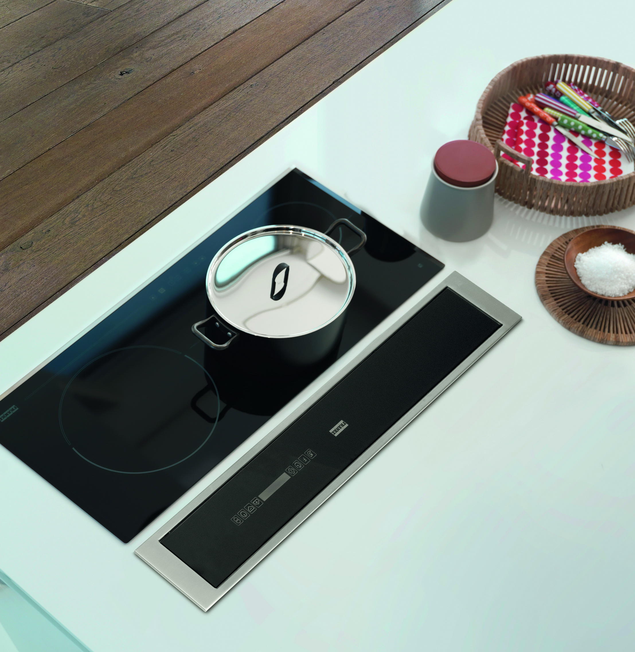 Przyzwyczajeni do okapów sufitowych, ściennych lub wyspowych otwieramy się na nowy rodzaj urządzeń, do okapów schowanych całkowicie w blacie i nadających się do każdego typu zabudowy kuchennej. Nowy okap Franke to rozwiązanie, które sprawdzi się w dużej i przestrzennej kuchni, także na wyspie, ukazując piękno płyty oraz otwierając przestrzeń nad nią, która dotąd była zarezerwowana dla okapu. Nowy, minimalistyczny trend wzorniczy, który daje się zauważyć także u producentów AGD, doskonale się sprawdza w praktyce. Urządzenia kuchenne coraz bardziej poukrywane są w zabudowie, widoczne pozostają przeszklone panele sterujące oraz niezwykłe efekty kulinarne.