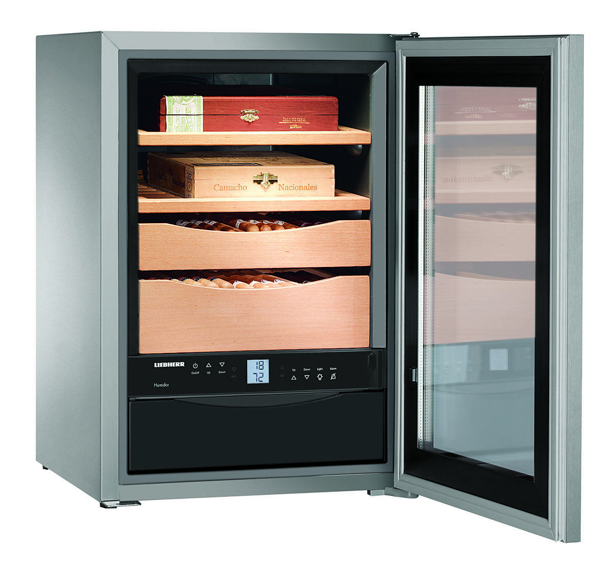 Cygara są od dawna symbolem klasy i prestiżu, a pasja palenia urosła do rangi rytuału. Dla amatorów wyszukanych przyjemności idealnym rozwiązaniem będzie specjalistyczna chłodziarka do przechowywania cygar – humidor ZKes 453 marki Liebherr. Urządzenie pozwala na długotrwałe przechowywanie cygar dzięki precyzyjnej regulacji temperatury (od 16°C do +20 °C) i wilgotności (w granicach 68% – 75%), gwarantując zachowanie ich jakości oraz niepowtarzalnego aromatu. Zainstalowany w humidorze ZKes 453 elektroniczny system kontroli z dotykową obsługą pozwala na ustawienie parametrów według własnych potrzeb, a ogromna dbałość o jakość wykończenia urządzenia potwierdza jego wysoką klasę. Półki i kasetki z cedru hiszpańskiego, przeszklone drzwi oraz przyciemniane oświetlenie LED znakomicie wpisują się w ekskluzywny charakter humidora Liebherr.