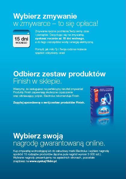 Teraz jest najlepszy moment, aby kupić zmywarkę Real Life. W dniach 31 marca – 10 czerwca 2012 roku zakup każdej zmywarki Electrolux jest premiowany nagrodą oraz zestawem produktów Finish. Aby otrzymać nagrodę gwarantowaną w promocji zmywarek Electrolux (biżuterię marki YES, produkty marki DUKA lub urządzenie drobne marki Electrolux) należy zarejestrować zakup na stronie www.zyskaj15dni.pl załączając skan dowodu zakupu. Po otrzymaniu unikalnego kodu, można wybrać jedną z 15 gwarantowanych nagród prezentowanych na stronie www.zyskaj15dni.pl, którą dostarczy kurier. Gwarantowany zestaw produktów Finisz jest do odebrania bezpośrednio w sklepie. Regulamin promocji dostępny jest na stronie: www.zyskaj15dni.pl.