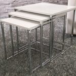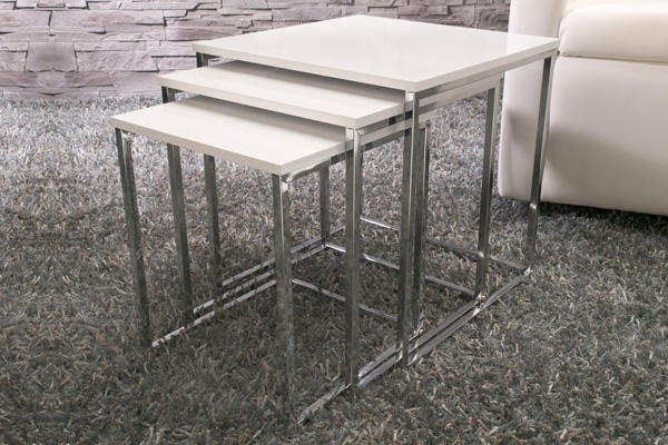 Wpadło kilku niezapowiedzianych gości? Wybrniesz z sytuacji, dzięki zestawowi COMBO, który składa się z trzech stolików wsuwanych pod siebie. Taka opcja umożliwia szybką modyfikację potrzebnej przestrzeni – zgodnie z bieżącą potrzebą. Konstrukcja wykonana z chromowanego metalu i lakierowane na biało blaty to bardzo eleganckie i trwałe połączenie.