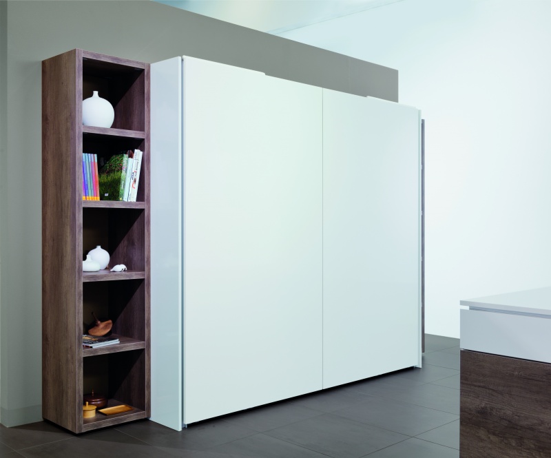 Dzięki temu, że SlideLine M jest systemem dwutorowym, co oznacza, że drzwi przesuwają się po dwóch torach, szafkę można całkowicie zamknąć. Natomiast po otwarciu, drzwi „chowają” się za siebie, zapewniając wygodny dostęp do otwartej części mebla.