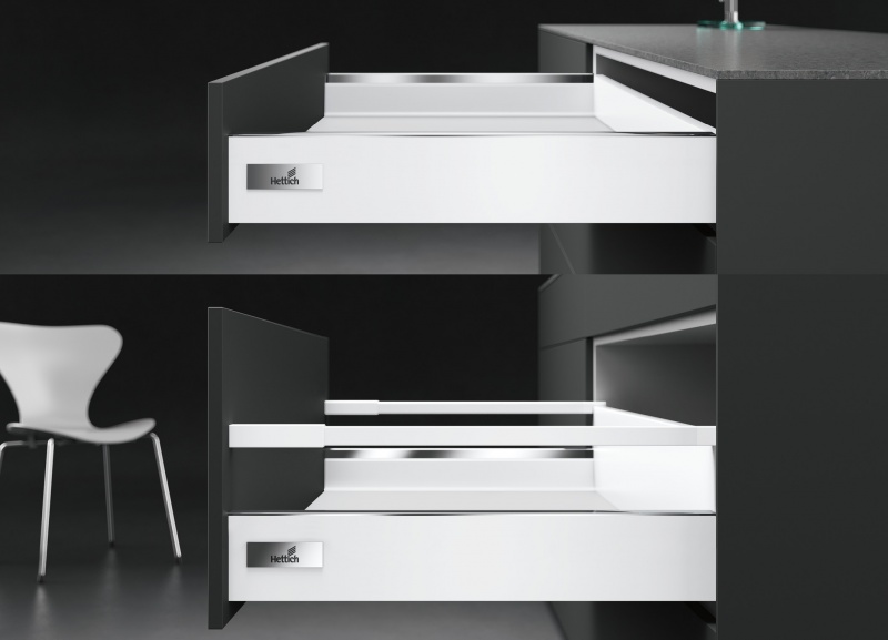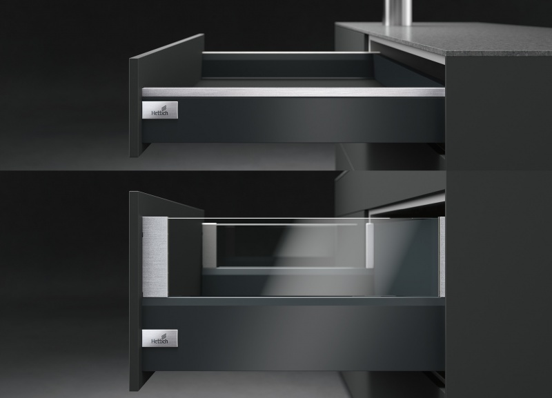 Systemy szuflad ArciTech i InnoTech Atira to niezwykle prestiżowe rozwiązanie nie tylko ze względu na funkcjonalność, ale również estetykę wykonania i nowoczesny design. Dużą zaletą tych szuflad jest możliwość indywidualnego wyboru elementów bocznych. Bok szuflady, dopasowany do projektu mebli, może być biały, srebrny, szampański, w kolorze antracytu czy ze stali nierdzewnej. W zależności od upodobań może być zakończony relingiem lub też opcją TopSide z metalu czy DesignSide ze szkła, jak również innych materiałów komponujących się z dekorem frontów.